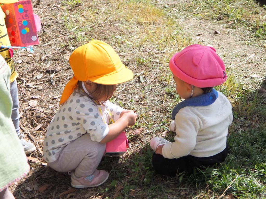 さぁ~!!!また出発です。おともだちと手を繋いで溝に落ちないように…転ばないように…強い足で沢山歩きました。ドングリや落ち葉をたくさん見つけ、嬉しそうに拾ったり見せあいっこをしたりしていた子ども達です☺