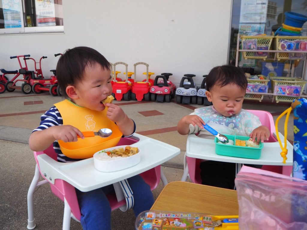 沢山歩いてお腹はペコペコ(*´ω`)楽しみにしていた愛情たっぷりのお弁当を園庭で頂きました🍙ドキドキわくわくしながら蓋を開け、おいしそうなお弁当に大喜びでした🧡🧡