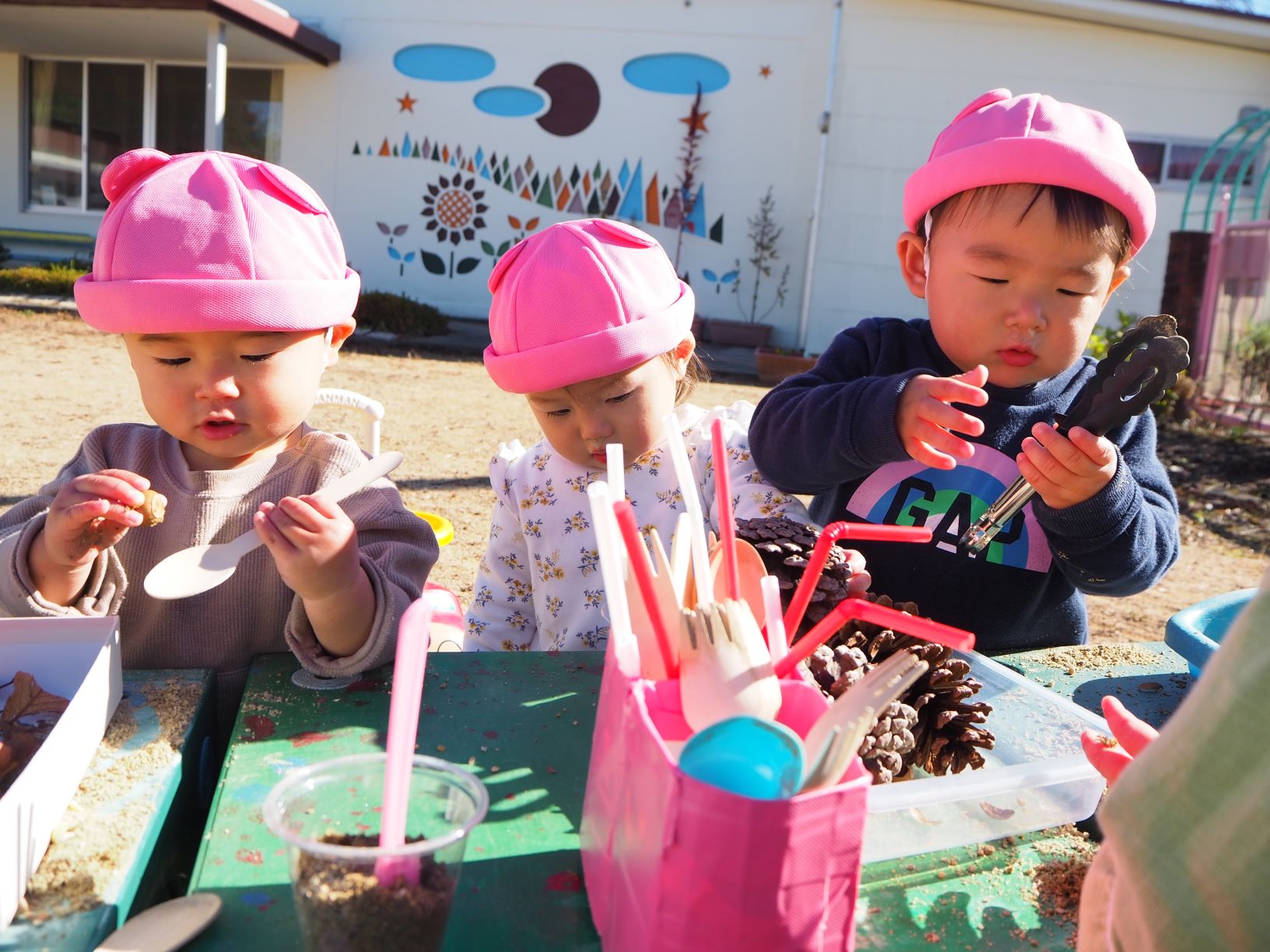 砂場でドングリや落ち葉、まつぼっくりをカップに入れたり、フライパンに落ち葉を入れてスプーンで混ぜたりして秋の自然物に触れた遊びを楽しんでいます。