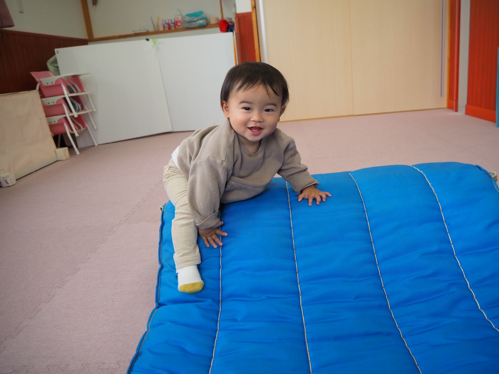 マットの坂道を上ってみたよ!!強い足で坂を上って、最後は滑り台のように滑って楽しんでいました。