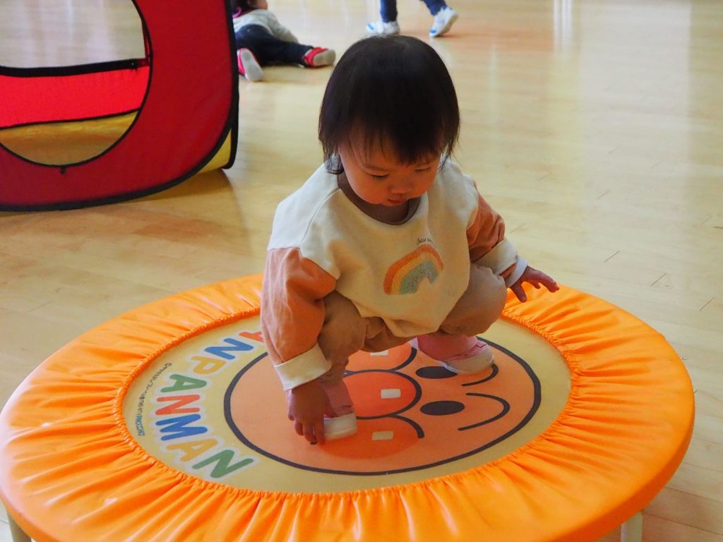 トランポリン!!少しドキドキしながらトランポリンに乗ってみました。最初は保育者と手を繋いでいましたが慣れてくると一人でバランスをとっていました🌟