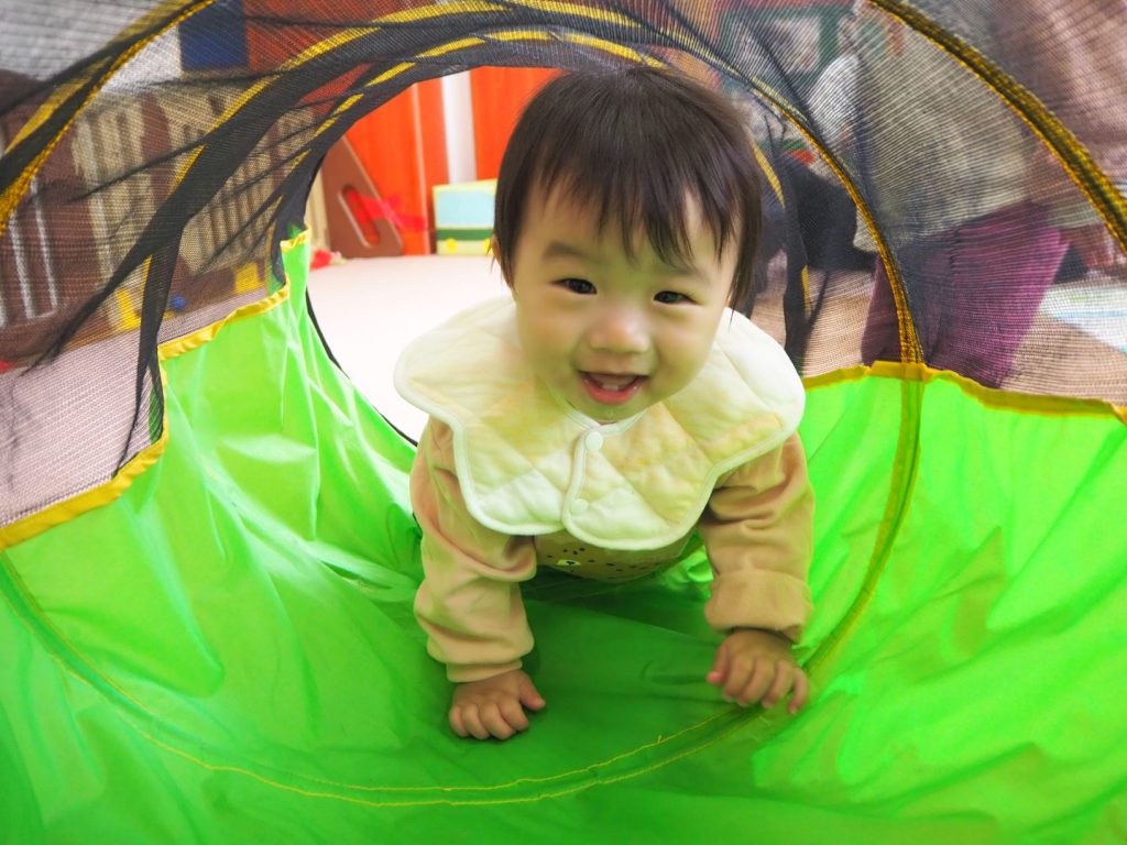 トンネルに挑戦!!初めてトンネルをくぐり保育者とハイタッチ!笑顔いっぱいです🧡