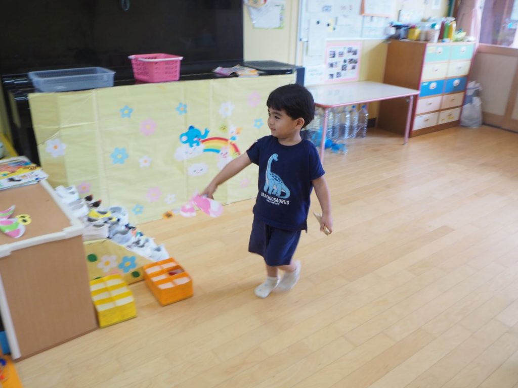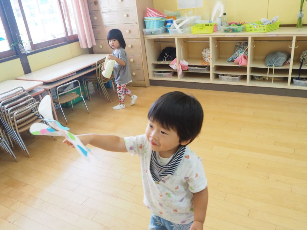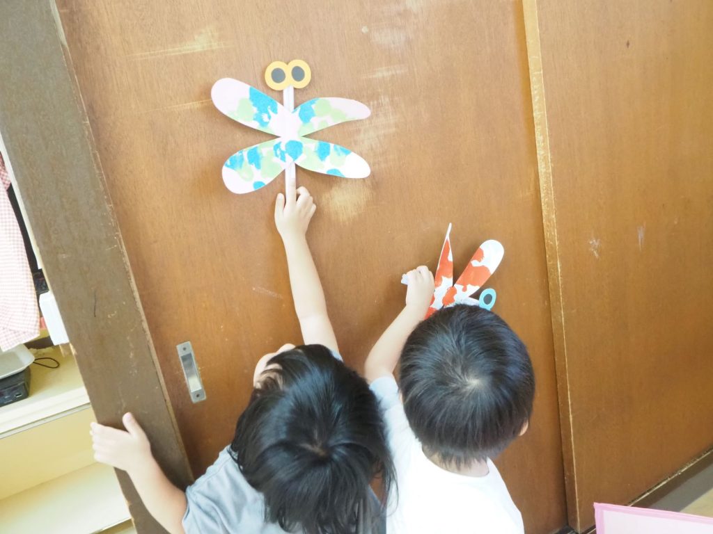 製作でトンボやバッタを作り、トンボは「びゆ~ん」と言いながら飛ばしてみたり、「ピタッ」と止まらせてみたり・・・