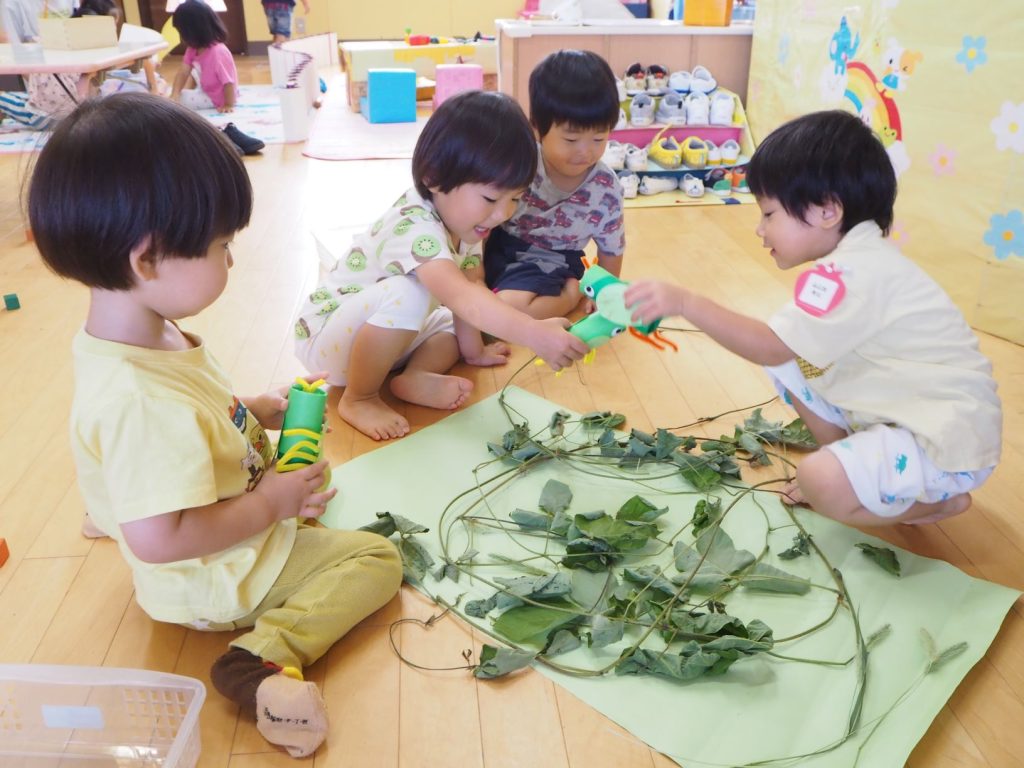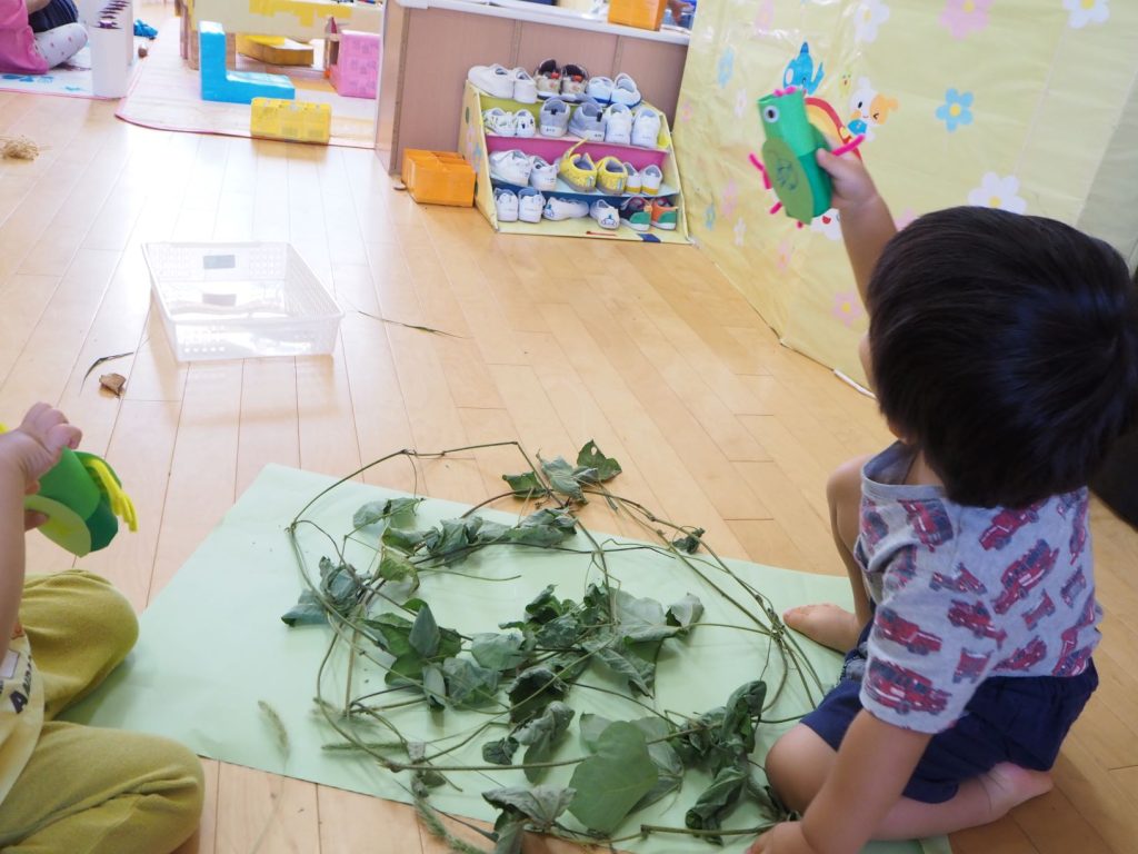 バッタを優しく持って小さく飛ばしたり、高く飛ばしたり。散歩に行って見つけたツルを置いておくと、「バッタのおうちみたいー!」と言って、ツルの上で遊ばせてみたりしていました。