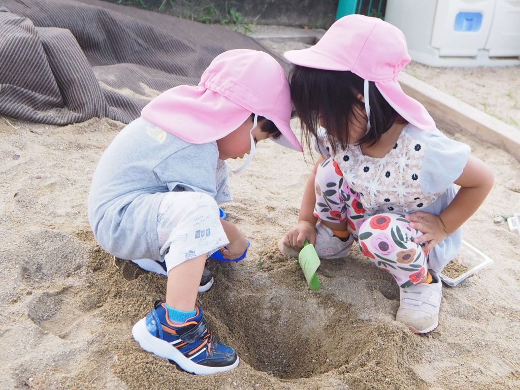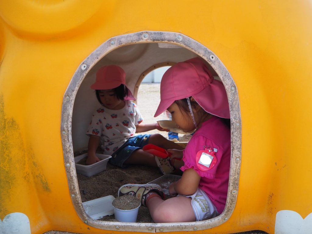 砂遊びも大人気で、穴を掘ったり、山を作ったり、いろいろな大きさのカップを使ってミックスジュースを作ったり・・・ぞうさん滑り台の下の秘密基地でパーティーをして盛り上がっている子ども達もいます(^^)v