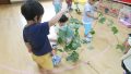 手に持っていると、きりんぐみの友達が見に来てくれて、葉っぱのにおいをかいでいました。