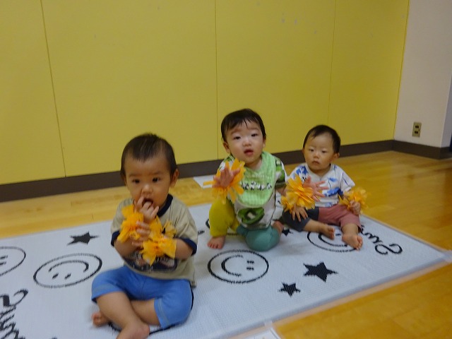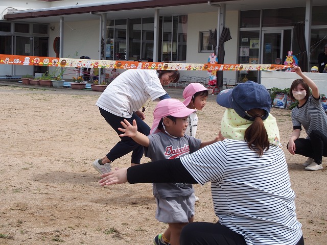 3歳児はやる気満々!2歳児は3歳児に憧れながら一生懸命♡、1歳児は素敵な飾りを腰元につけてニッコニコ(*^-^*)、0歳児は広い遊戯室で伸び伸び☆な姿が見られました。それぞれ、年齢に合わせた内容の運動遊びを楽しんでいます。