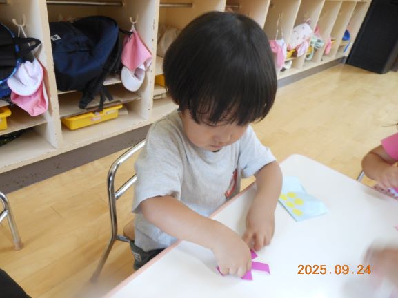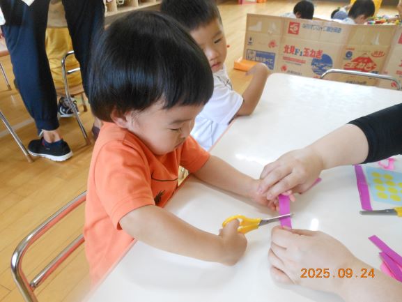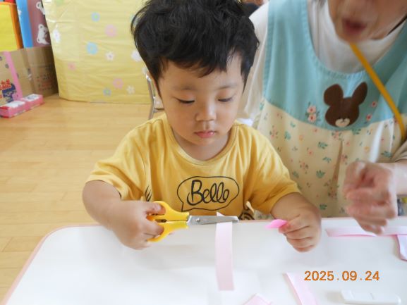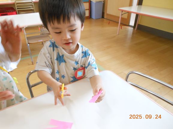 戸外遊びに出る機会が増えて、運動遊びや車など好きな遊びを元気に楽しんでいます。遊んでいる時花壇にコスモスが咲いているのを見つけて「こっちきて~」と、手を引いて連れて行ってくれます。「見て!お花咲いてる!」と自慢げに教えてくれます。コスモスを見ながら「コスモスって言うんだよ」と伝えると、「ふ~ん。」とじっくりと見ていました。コスモスに興味をもっていたので、作ってみることにしました。そこで、ハサミに挑戦です!