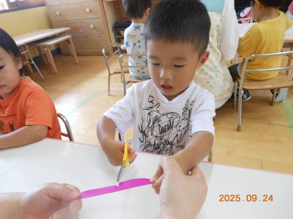 ハサミの一回切りに挑戦です。ハサミにも興味津々で早く使いたくて仕方ない感じでしたが、しっかりと約束をして使いました。内心ドキドキでしたが、色々な遊びを通して手先の力もついてきて、ちょっきん!と切ることができていました。切れるととっても嬉しそうでした。