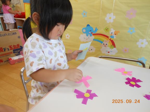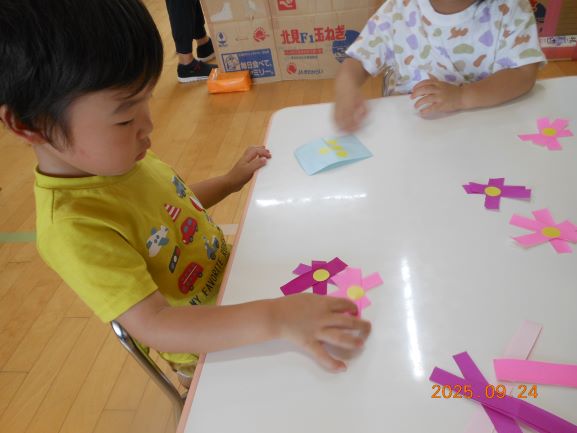 切った折り紙を貼り合わせて真ん中に黄色の丸シールを貼り出来上がり!みんなの作ったかわいいコスモスがお部屋の中に咲きました。