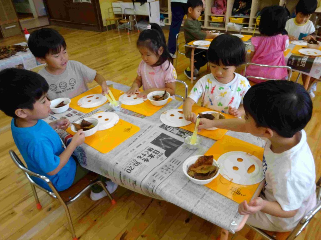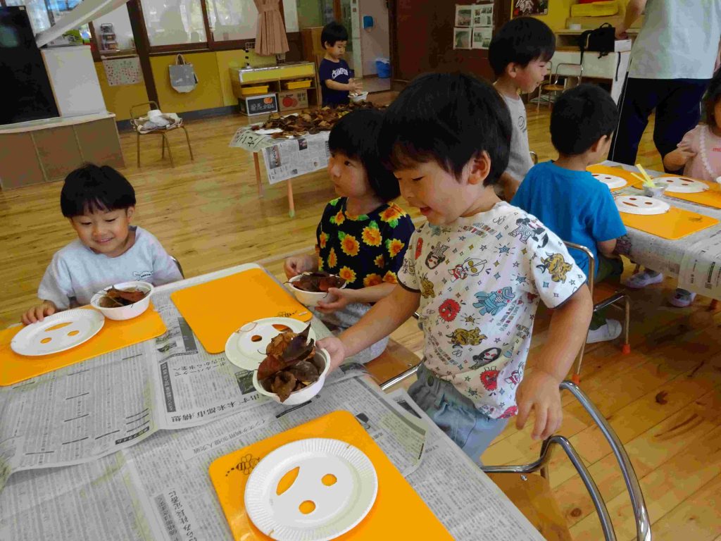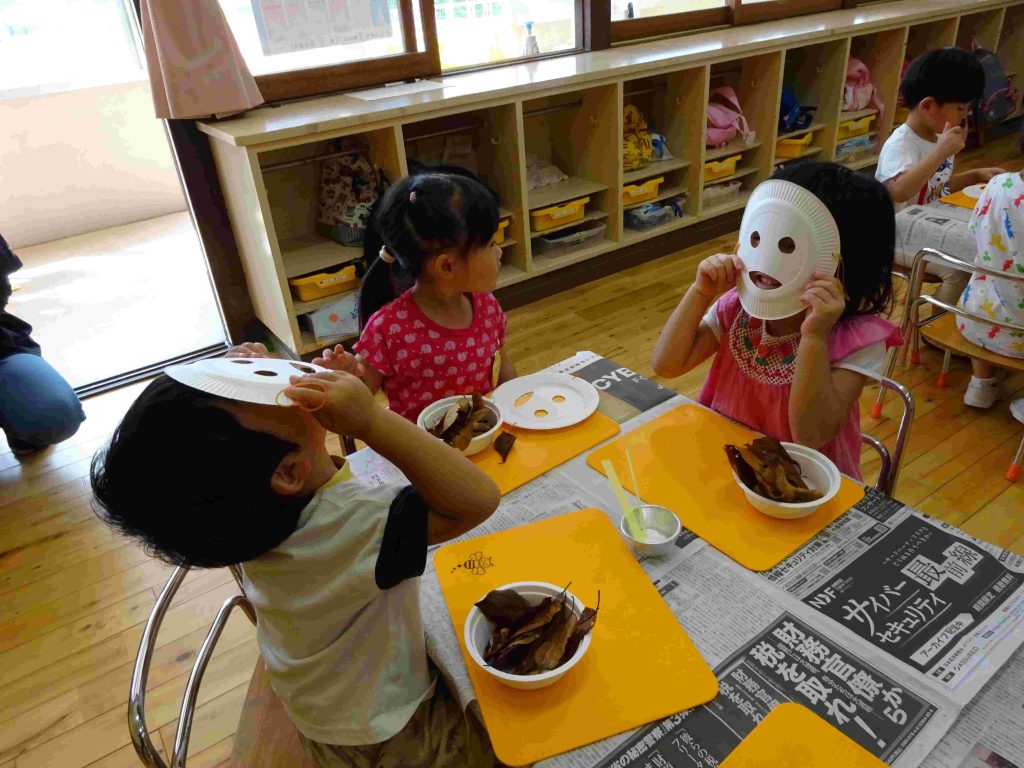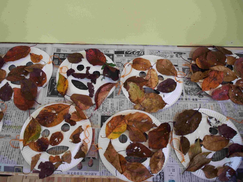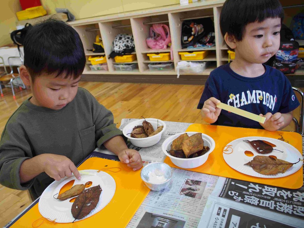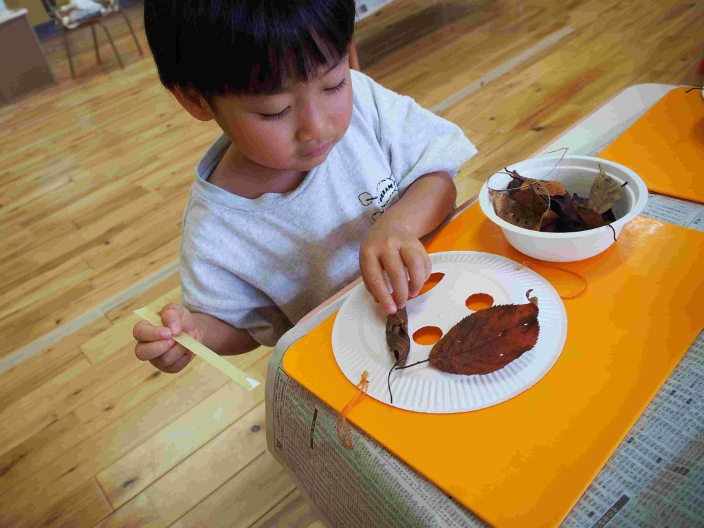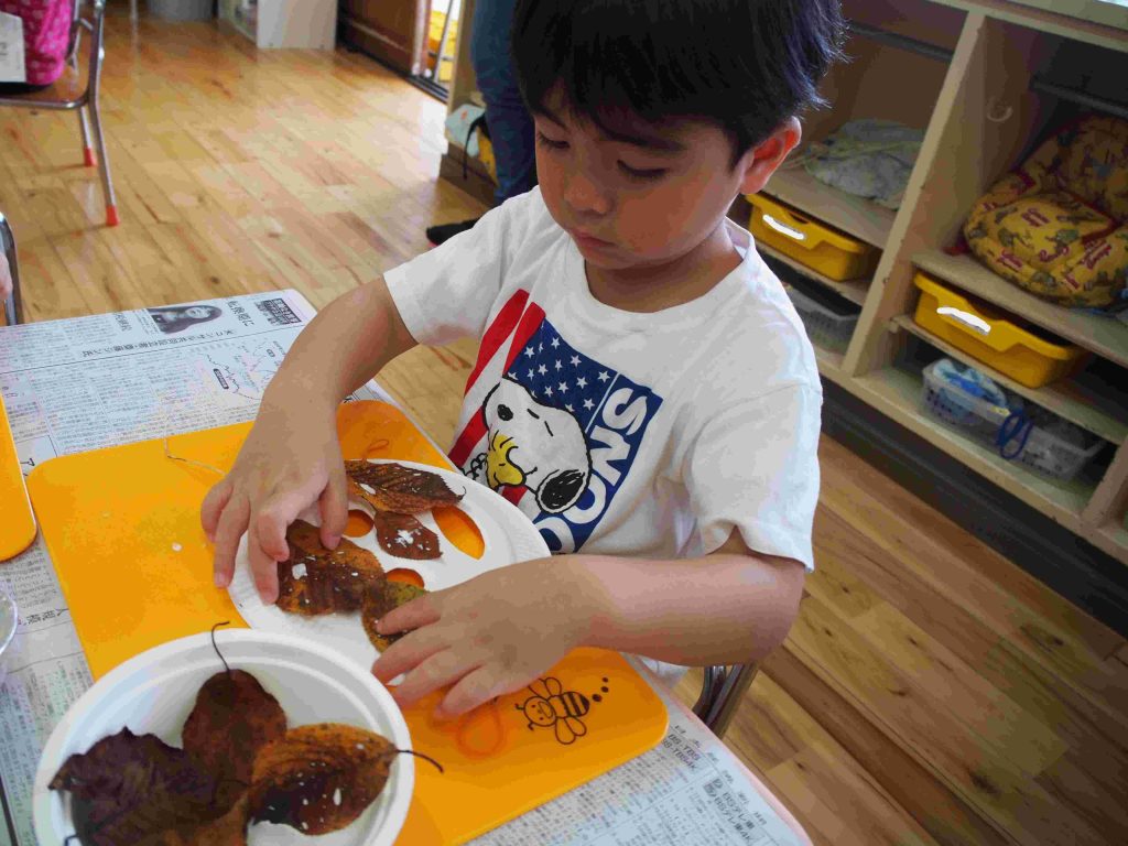 お面が配られると、自分の顔に合わせてお友達と笑い合い、「お面や!」「お祭りで見た事ある!」「ちょっと怖いで!」と楽しそうな子ども達です。その後は、自分の気に入った葉っぱを取りに行きます。自分の机に戻ると、「へへ。これにした!」「○○ちゃん、いっぱいとったね!」と楽しそうなやりとりが聞こえました。