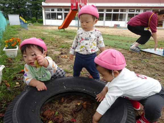 じっと見てみたり、触ってみたり、タイヤの中にたくさん入っている葉っぱを出したり入れたりしながら遊びました。