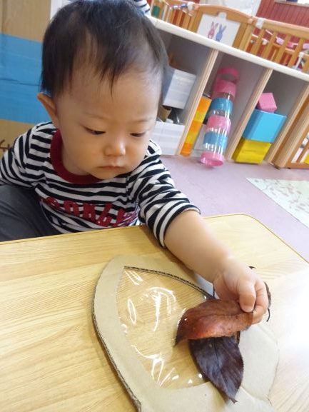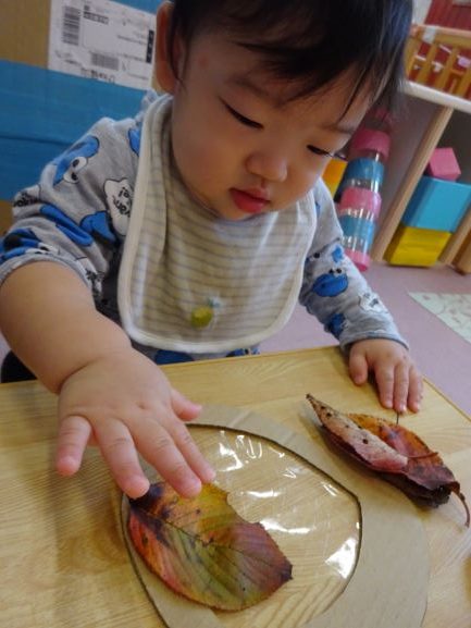 自然物を使って、制作をした後に、園庭に出て遊んでいると、すぐに桜の木の下へ行き、葉っぱをみつけて、保育士に見せてくれました。制作をする際に、葉っぱを使ったことで、前よりも葉っぱに興味が出てきたようでした。