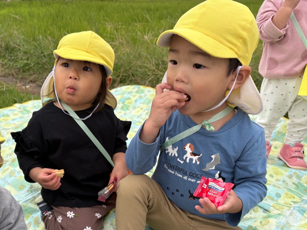 目的地に着き、おやつを食べたり、水筒でお茶を飲んだりし、一休みしました。その後、草花を見つけたり、保育士が見つけたバッタに興味津々の子どもたちでした。