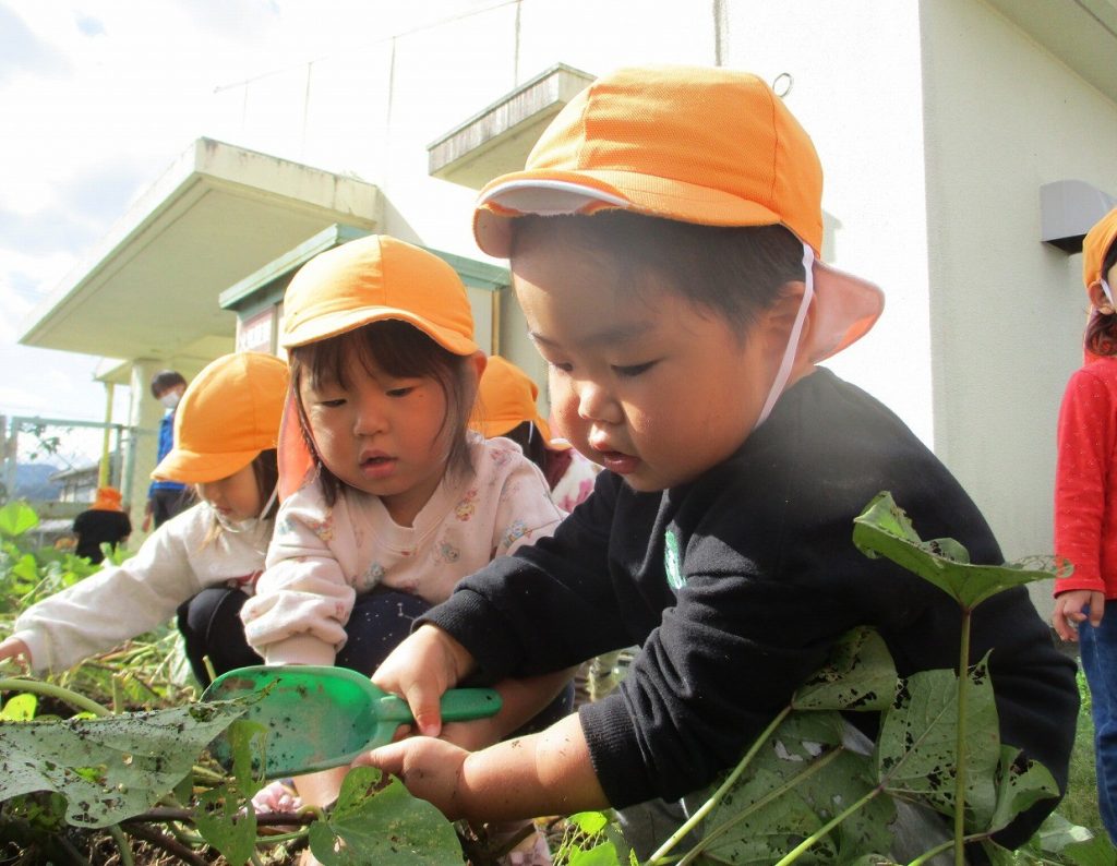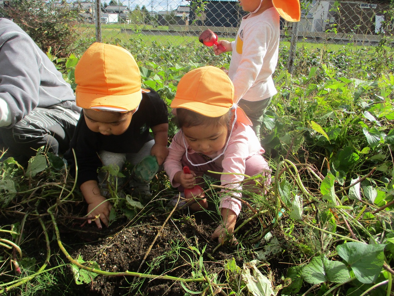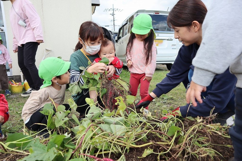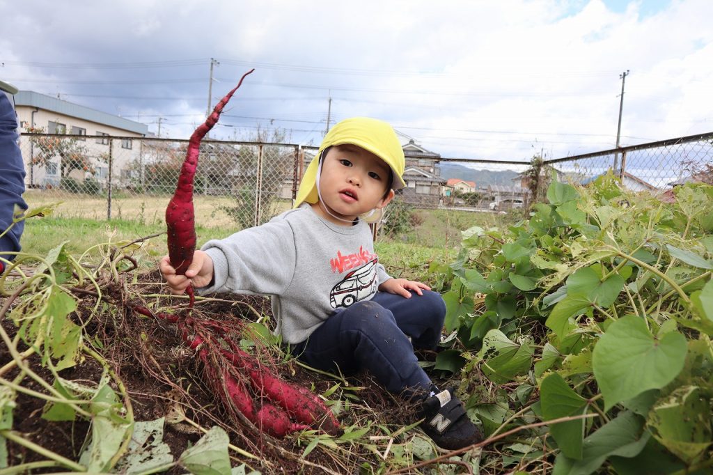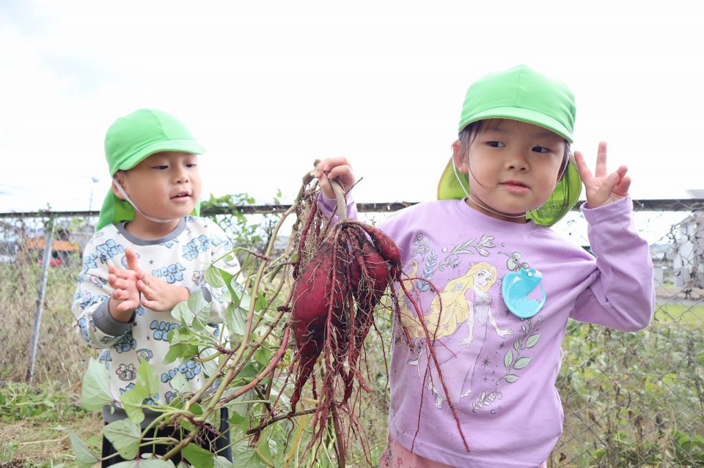 サツマイモとれたよ! 未分類 2025.10.28 「がんばるぞー!」と気合十分な子どもたち(*^-^*) 友達と力を合わせて「うんとこしょっ♪どっこいしょっ♪」と蔓を引っ張りました! なかなか抜けず苦戦する姿もありましたが、「とれたー!!」と大喜びで見せてくれました。 「小さいのも見つけたで」「ごぼうみたいなのあった!」と様々なサツマイモの形に興味をもっていました。 たくさん穫れたね☆ 今度は焼き芋しようね!