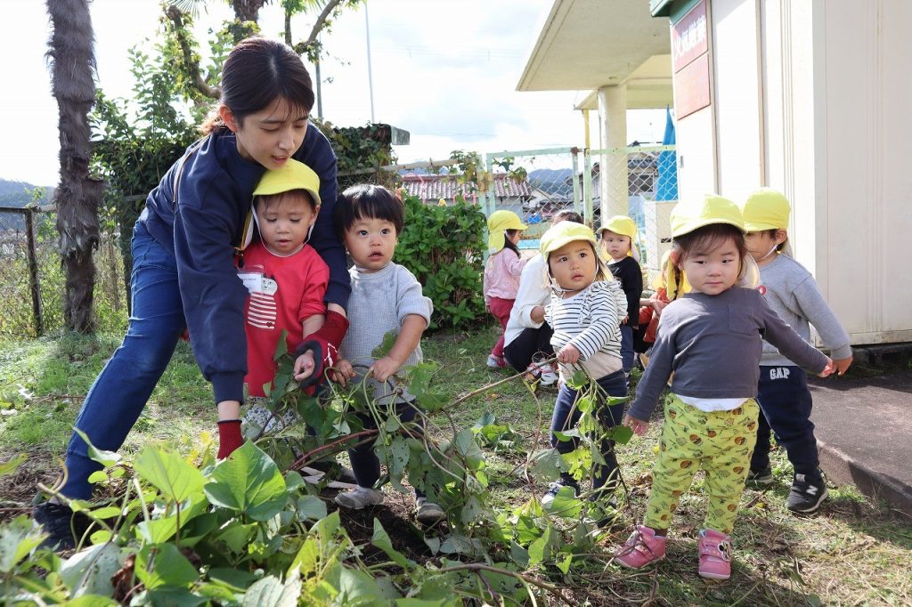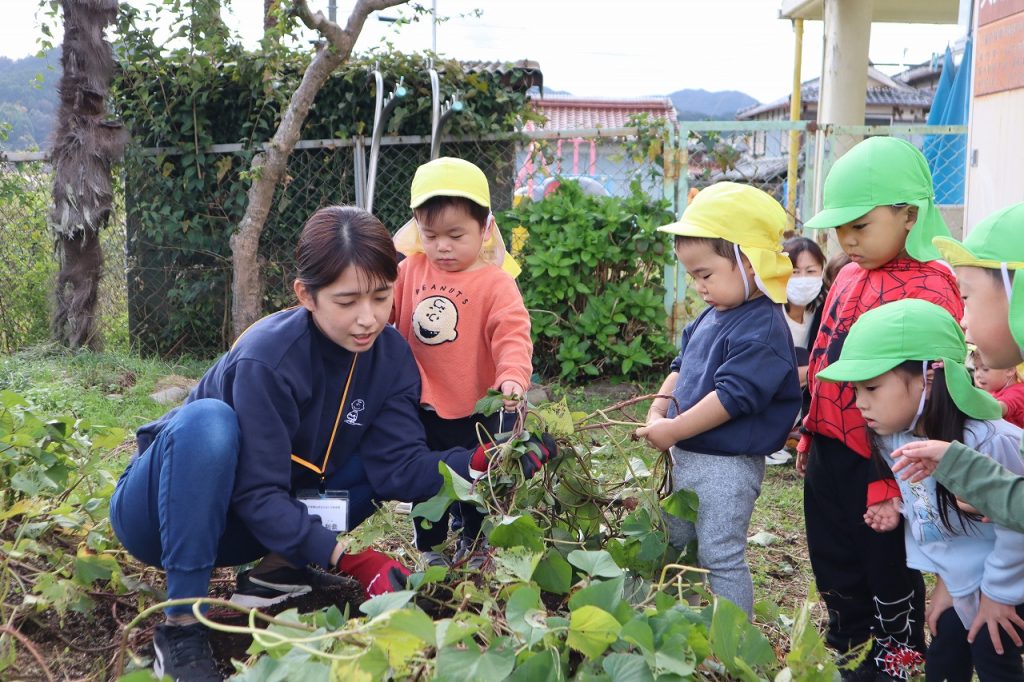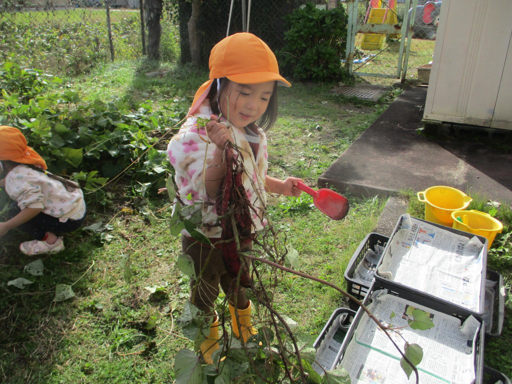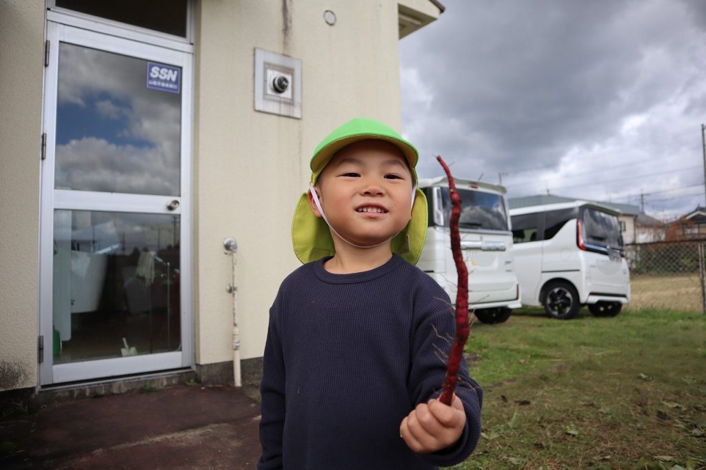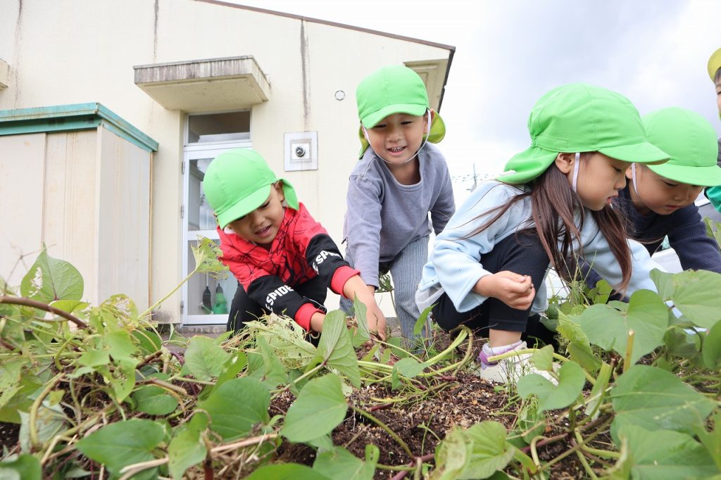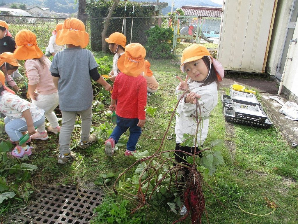 サツマイモとれたよ! 未分類 2025.10.28 「がんばるぞー!」と気合十分な子どもたち(*^-^*) 友達と力を合わせて「うんとこしょっ♪どっこいしょっ♪」と蔓を引っ張りました! なかなか抜けず苦戦する姿もありましたが、「とれたー!!」と大喜びで見せてくれました。 「小さいのも見つけたで」「ごぼうみたいなのあった!」と様々なサツマイモの形に興味をもっていました。 たくさん穫れたね☆ 今度は焼き芋しようね!