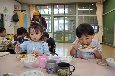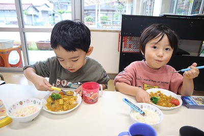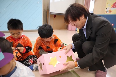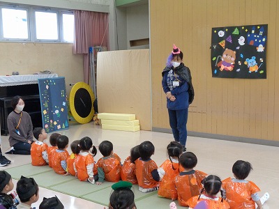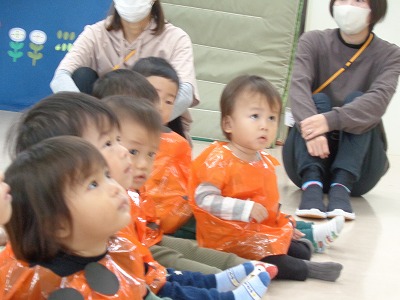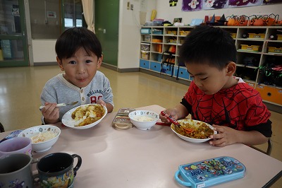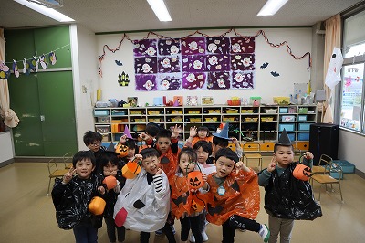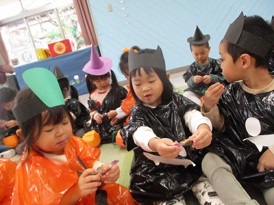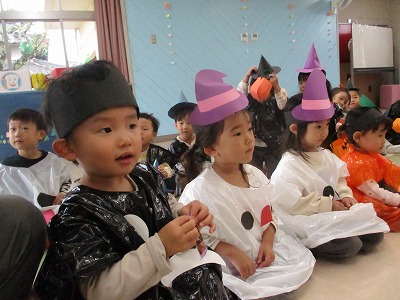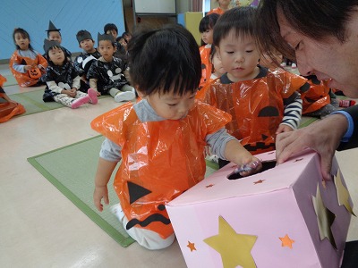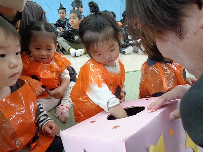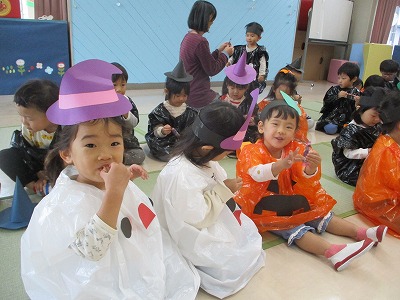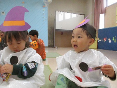 ハッピーハロウィン!♪ 0歳児(たかしろ) 2025.10.31 たかしろ保育園 みんなとってもかわいいオバケたちに変身して集まりました♪「ホロウィンってなに?」「なんでオバケなどの格好をしているの?」とお話を聞きました。 「トリック ア トリート―!」「お菓子をくれなきゃイタズラしちゃうぞ」覚えたての呪文を言ってお菓子をいただきました♪ おいしそうだね♫ 給食はホロウィンカレー!!大根をスライスしたお化けやニンジンをスライスしたカボチャがかわいかったね。とってもおいしかったよ。