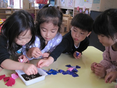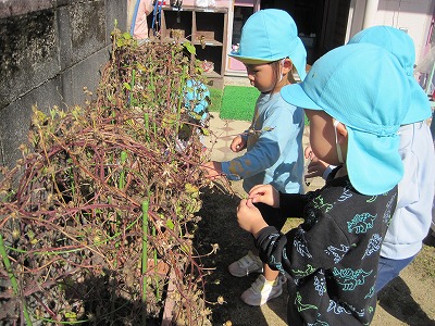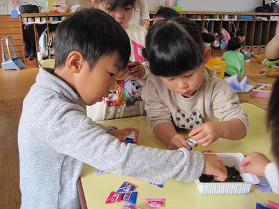 あさがおのたね 3歳児(にしき) 2025.11.07 にしき保育園 あさがおの花が終わったので、みんなで種取りをしました。 「この茶色の中に種が入っているよ!」 「み~つけた!」 「みんなに種をプレゼントしよう!」 種取りしたのをみんなで袋に入れてラッピング♬ 欲しい方は一つずつ持って帰ってくださいね(#^.^#)