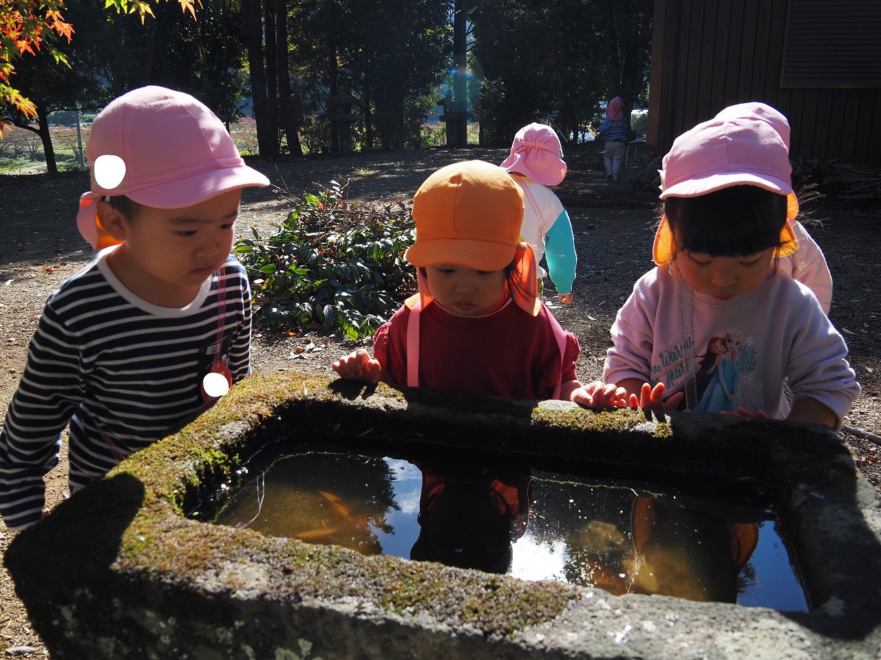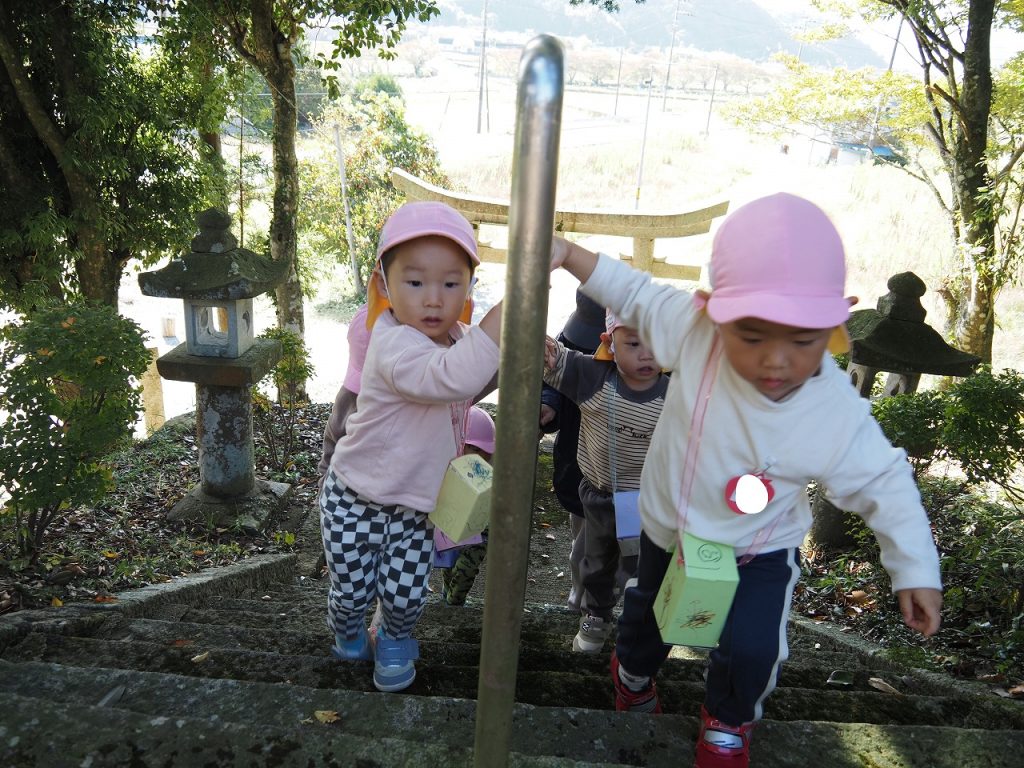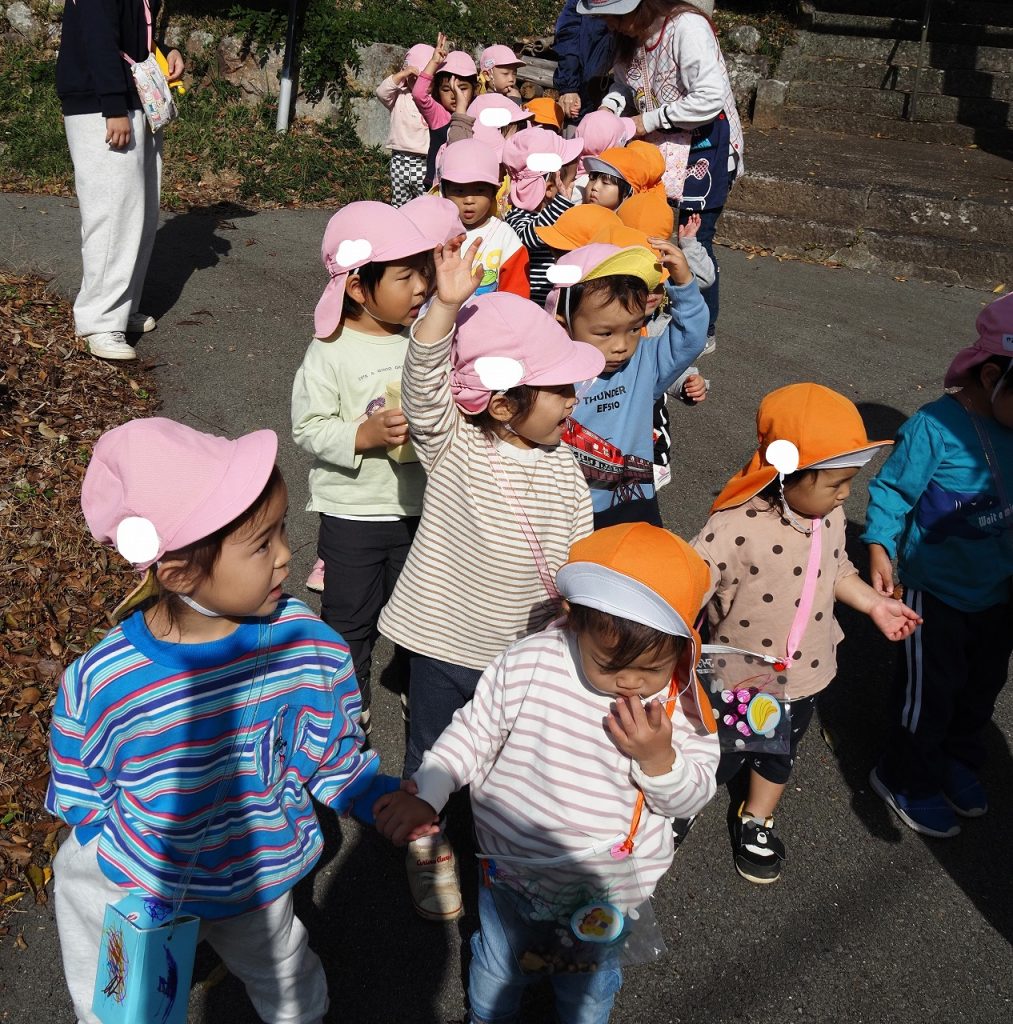 りす組、うさぎ組で一緒にお散歩に行きました♪ 1歳児(にしき) 2025.11.12 にしき保育園 お天気が良かったので、りす組(1歳児)とうさぎ組(2歳児)が一緒に近くの神社までお散歩に行きました。 りす組さんと手を繋ぐと、「〇〇ちゃん、かわいい」と嬉しそうなうさぎ組(2歳児)さん。 長い距離でしたが、仲良く手を繋いで歩いていました♪ 階段を上がると、神社に到着‼ ドングリや落ち葉等を探してはお散歩バックに入れて楽しんでいました。 帰り道も手を繋いで上手に歩くことが出来ました‼ お散歩楽しかったね♬ また、一緒に行こうね!