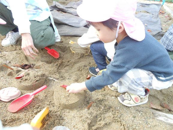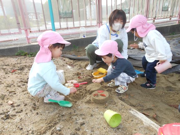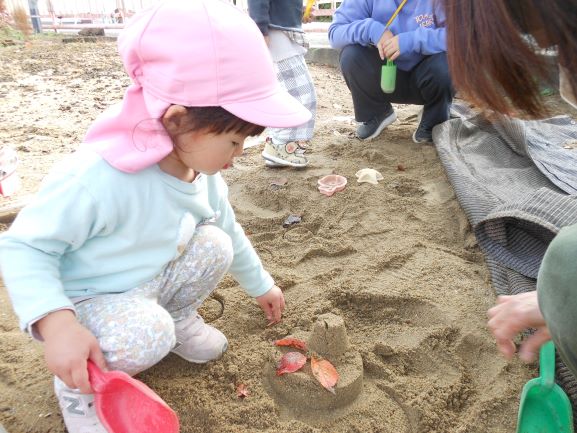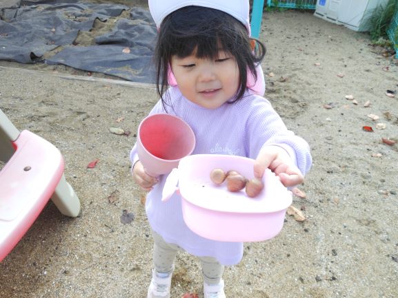 お天気の良い日はできるだけ戸外に出て遊ぶようにしていて、子ども達も元気いっぱいに楽しんでいます。乗用玩具や追いかけっこなど身体を動かすことが大好きですが、砂場で遊ぶ事も好きで友達と一緒にお喋りしながら遊んでいます。砂場で遊んでいる様子を見ていると、近くに転がっているどんぐりや落ち葉を拾って遊んでいました。