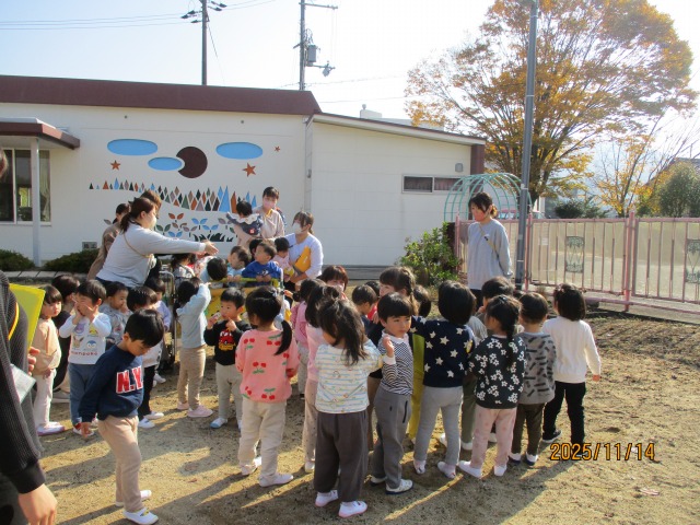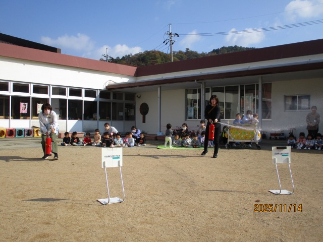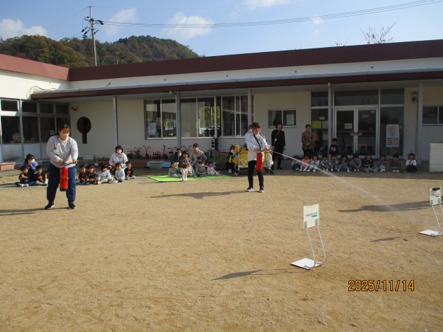 先生たちが水の入った消火器を使って、火に見立てた的を倒すと、子ども達から「先生!すごいね!」「先生、頑張ってたね!」と拍手とともに認めの言葉が子ども達から聞こえてきました。大切な子ども達の為に、日頃からの備えをさらにしておこうと気持ちを新たにした職員たちでした。