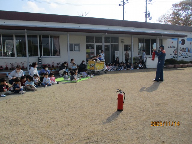 少し場所を移動して、全員で消防士さんからお話を聞きました。みんな、真剣な顔で話を聞いていました。次に、職員が初期消火のための消火器を使う練習をしました。