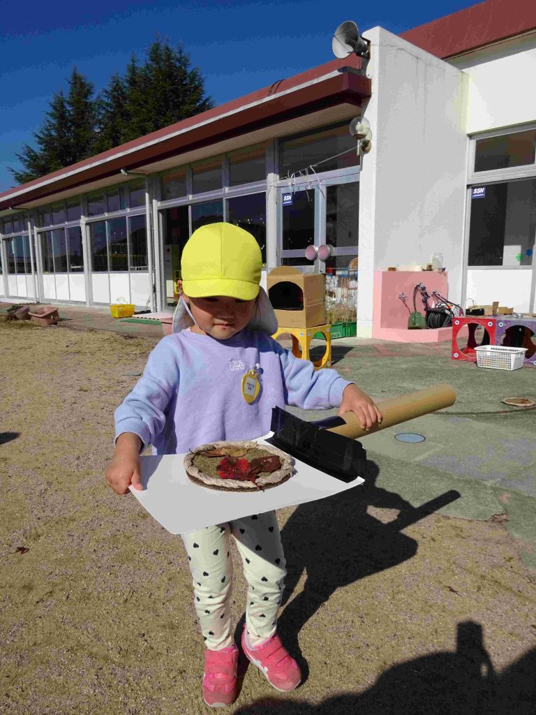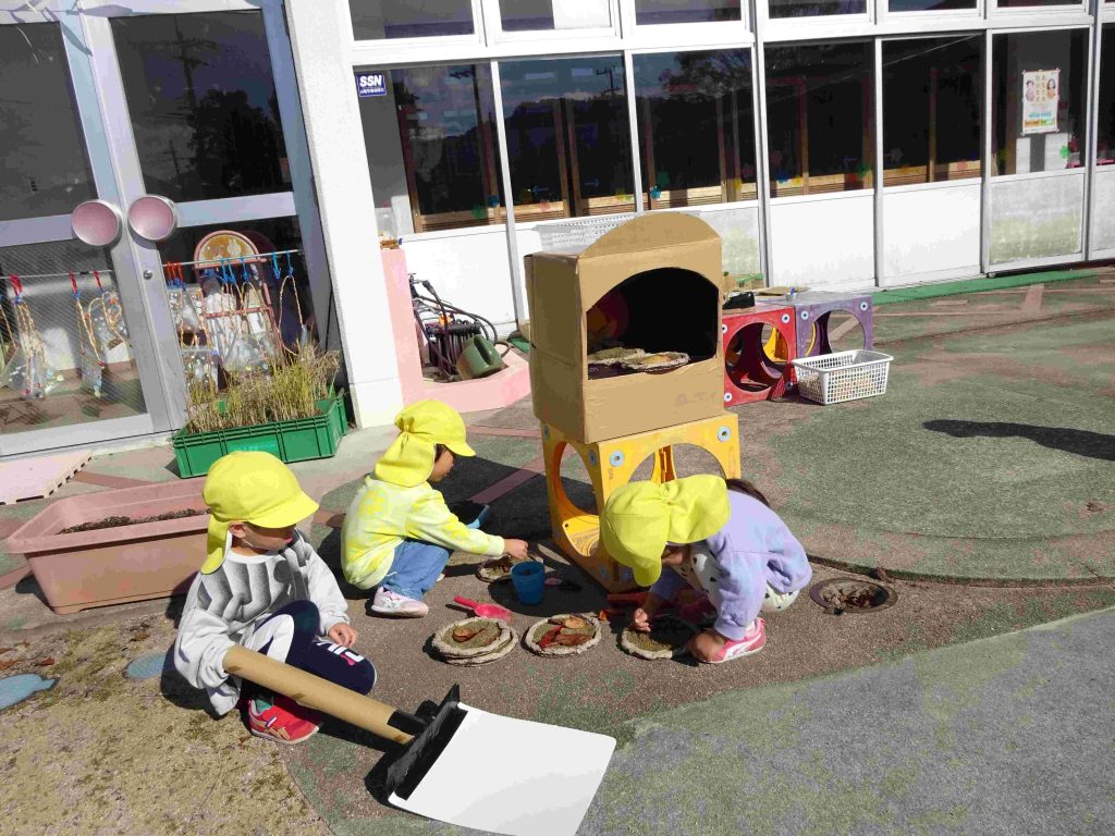 その横では、ピザ屋さんです。砂場の土をソースに見立ててピザ生地に塗り、園庭の葉っぱを乗せて焼いていきます。「いらっしゃいませ!」「熱いですよ!」「どうぞ~」「ありがとうございました」とデリバリーも始まりました。