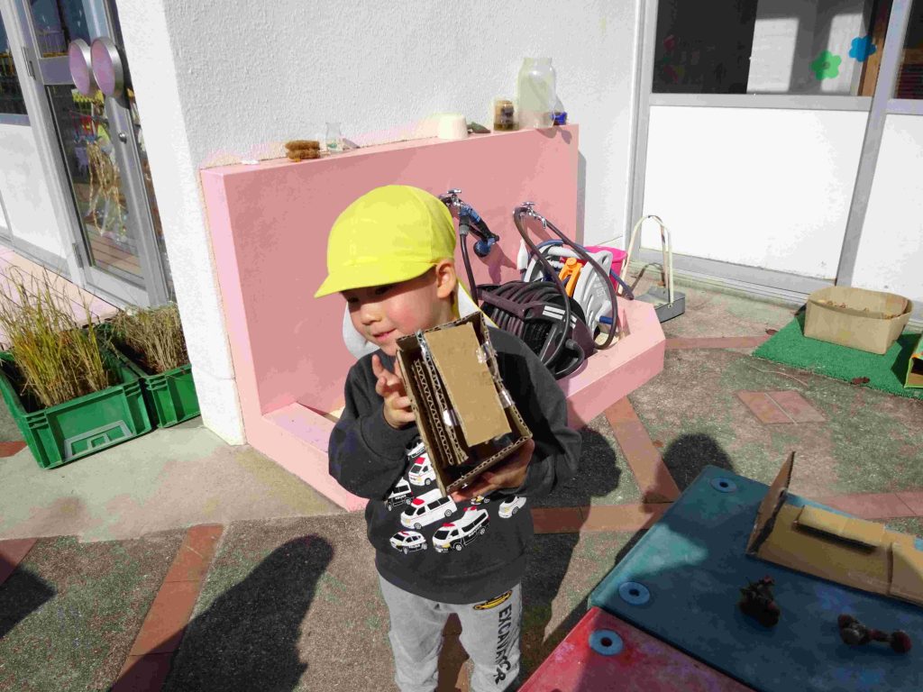 遊ぶ場所が必要と、人形さんのお家づくりがスタートしました。「段ボールいっぱい重ねて、ふかふかのベッド作った!」「壁と扉と屋根がほしい!」「起きてまぶしくないようにカーテン付けたいんだ」「くっつかないからテープにしよ!ください!」「よし!これでくっついた」「みてみて~できたよ」
