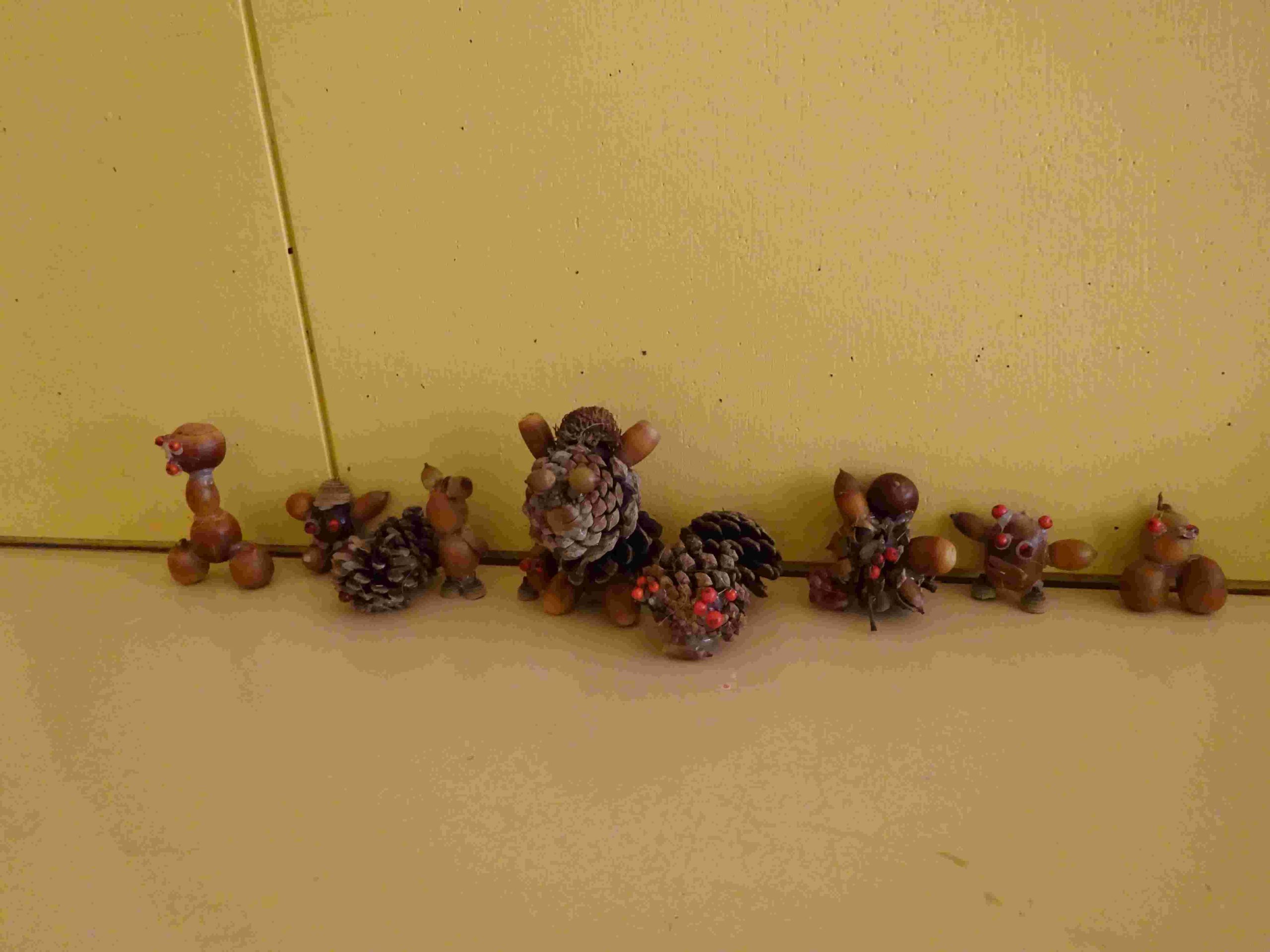 まずは、人形作りです。カップに使いたい自然物を集め、保育士と一緒にくっつけていきます。「これは足だからここ!」「(グルーガン)熱いから先生して。」「これは目になりそう」「帽子かぶせてあげよっかな」「にっこりのお口が欲しい!」「お口これにする!」「足はこれ!」「立つかな?立ってる!」「かわいいー!」と楽しそうな友達の声に「やってみたい!」「地球、作ってみる!」と参加者が増えていきます。