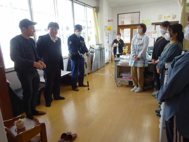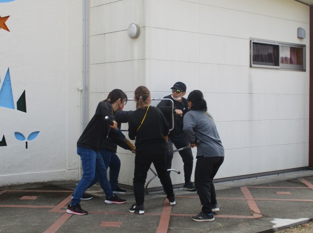 訓練終了後には、警察の方に今日の職員の動き方について講評していただくとともに、さすまたの使い方や不審者対応時のアドバイスもいただきました。万が一の時に備えて、訓練をしたり、職員の意識を高めたりしておきたいと改めて思いました。