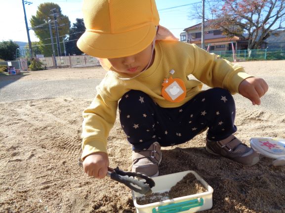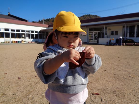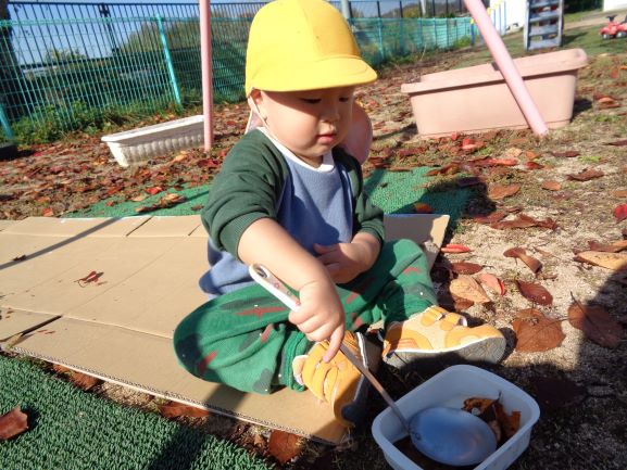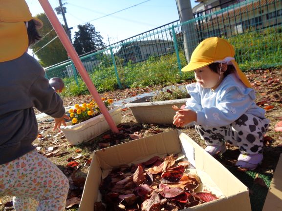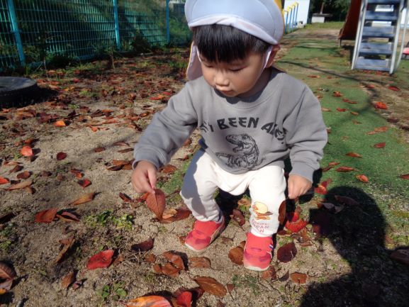 落ち葉に触れて秋から冬への季節感を感じることができました。また、落ち葉に興味をもつ園児も増えたので、今後もいろいろな落ち葉遊びを楽しみたいと思います♪