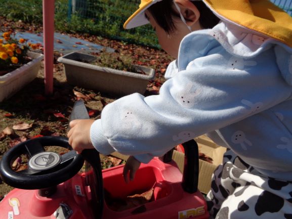 ある程度集まると、落ち葉を両手で持って上に投げ、落ち葉のシャワーを楽しんでいました♪落ち葉を集めて運びたい園児は、手押し車の中に気に入った落ち葉を入れていました。その様子をみて一緒に落ち葉を入れようとしたり、真似してみたりする姿も見られました。