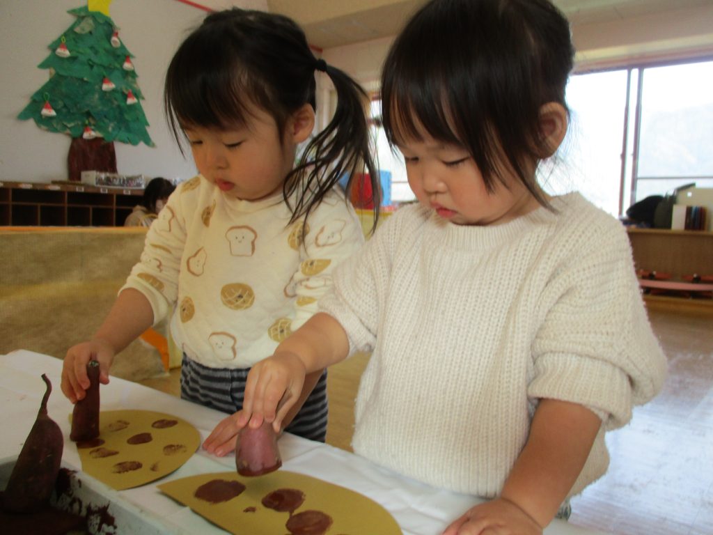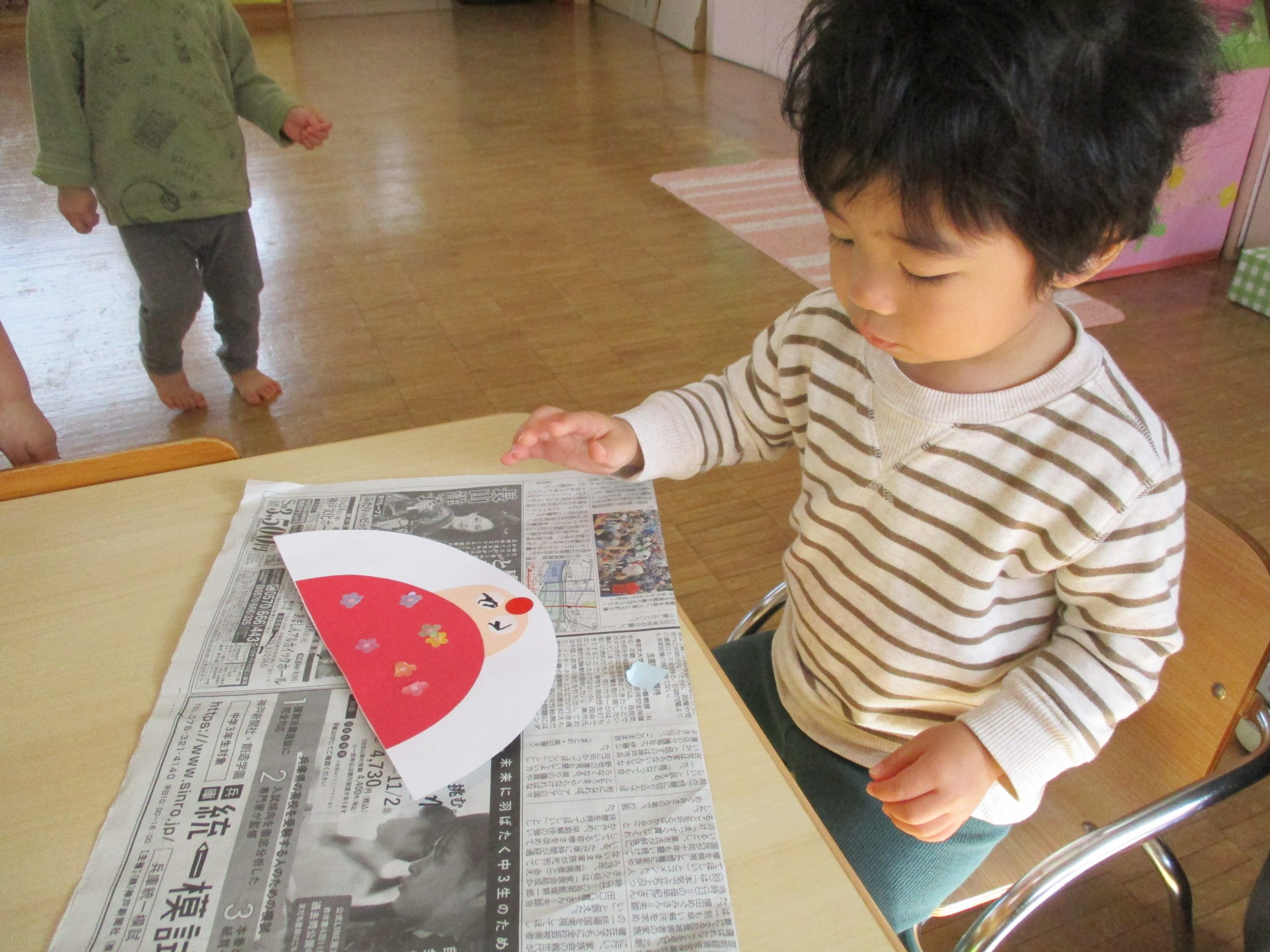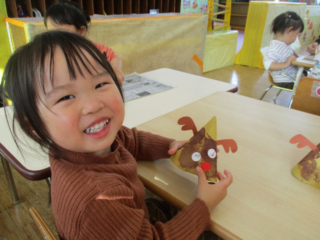 クリスマスの制作したよ 1歳児(にしき) 2025.12.172025.12.16 にしき保育園 サンタクロースの絵本を読んだり、手遊びを楽しんでいるりす組の子ども達。 サンタクロースとトナカイの制作も楽しみました。 トナカイはみんなで掘った小さなサツマイモを切って、芋判を楽しみました。 目のシールと赤鼻のシールを貼って完成!!! 完成したサンタクロースとトナカイは、鈴の音が鳴るようになっています。 みんなで「あわてんぼうのサンタクロース」の歌に合わせて、楽器遊びを楽しんでいます。 冬のお楽しみ会でも親子で楽しんでもらおうと思っています‼ 楽しみにしていてください♪