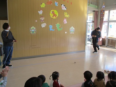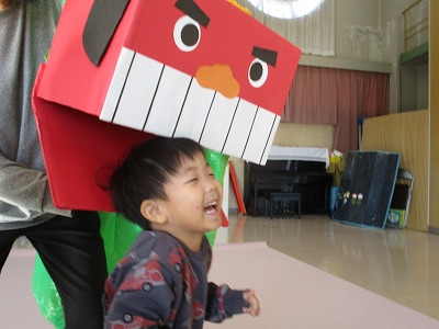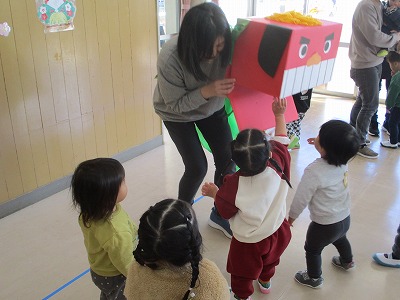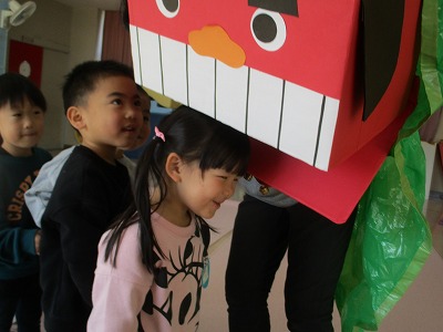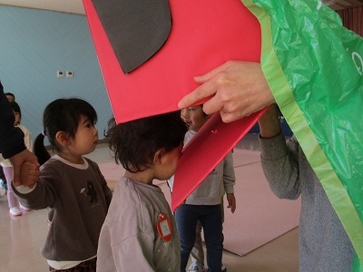 獅子舞も登場しました。「獅子舞に頭を噛んでもらうと風邪をひかず元気に過ごせる」と聞いて「かぷり」と噛んでもらったり、獅子舞にタッチをしたりして楽しみました。
