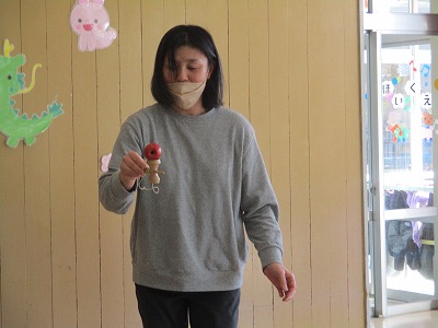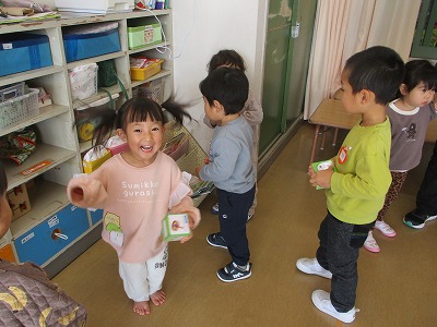 お正月お楽しみ会の後は各保育室に戻り、コマをもらいました。コマの宝探しで見つけるととても嬉しそうでした。
