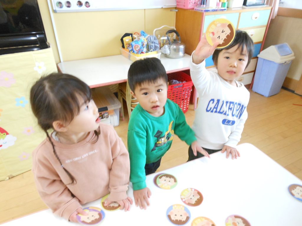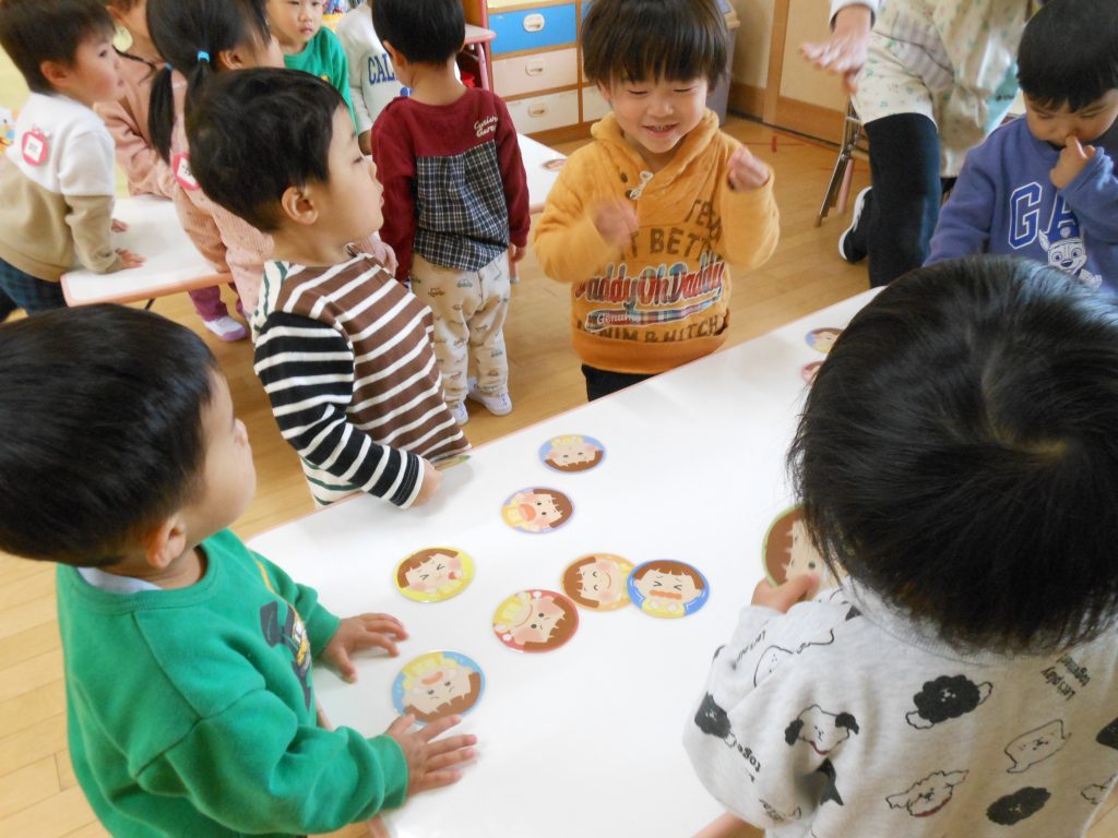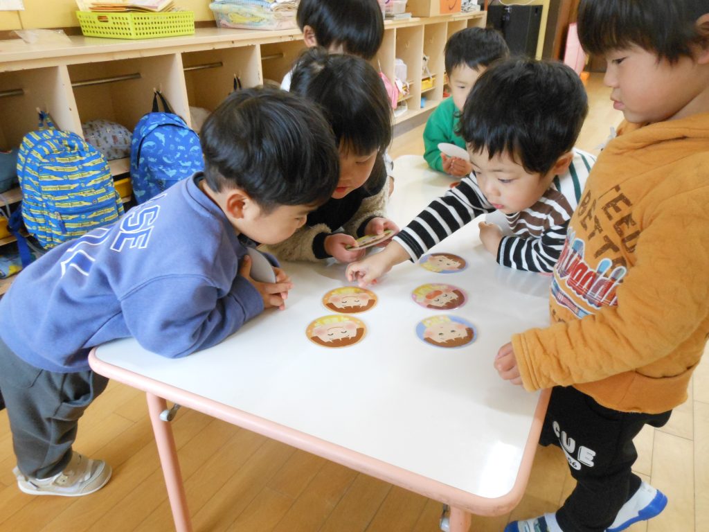年末年始を楽しく過ごし元気に登園して来てくれました。9日にお正月のお楽しみ会があり、保育者がする羽根つき、福笑い、こま回しといろいろなお正月の遊びを見て知ることができました。その時に、園長先生からクラスごとにプレゼントをいただきました。その中に入っていた絵合わせカードで遊んでいます。
