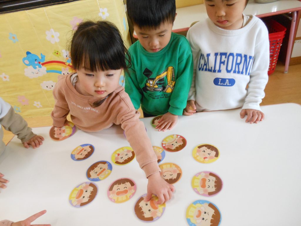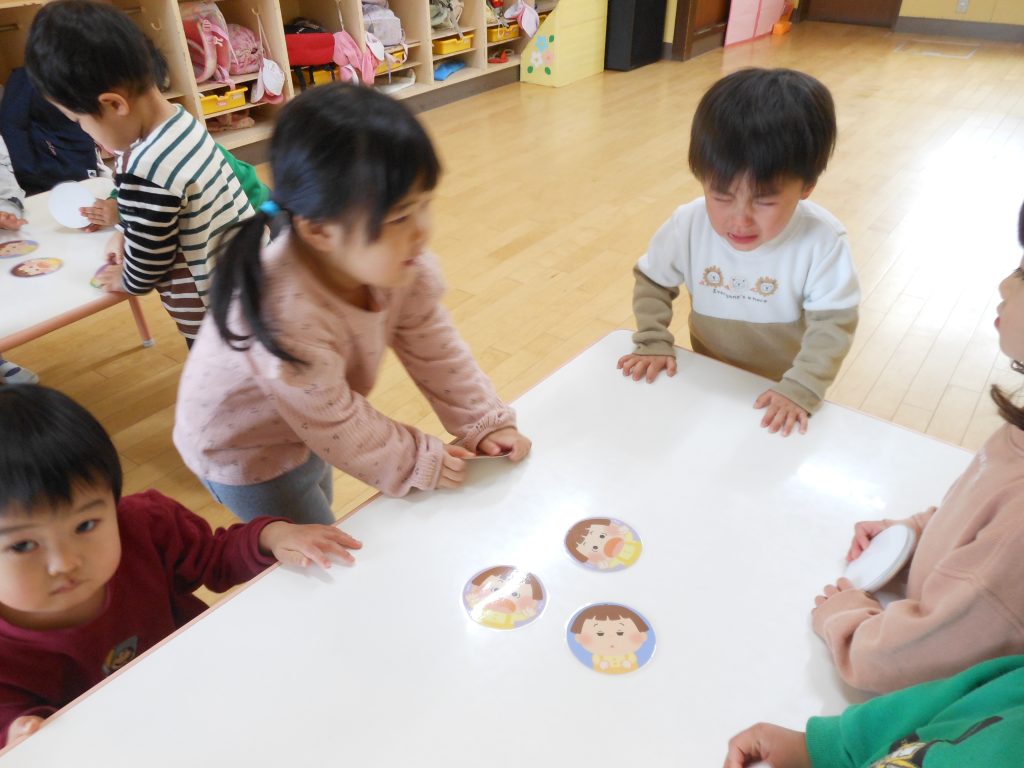 保育者が出す表情の絵と同じ絵を取っていきます。「はい!」と言いながら取り、取れると嬉しそうに「○○の顔取れた~‼」と見せてくれます。思っているカードが取れなくて、悔しくて涙の出る姿も見られます。絵を見て取るというのが最初は難しかったですが、遊ぶうちにやり方も分かり楽しめるようになっています。