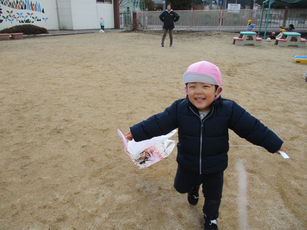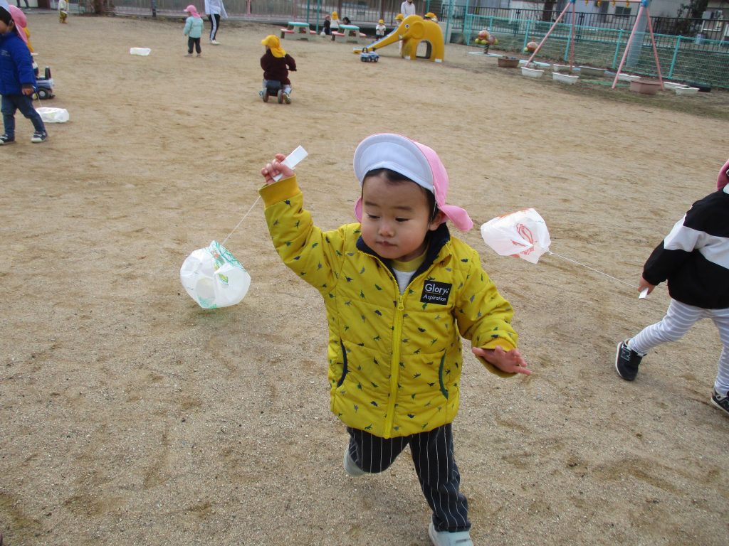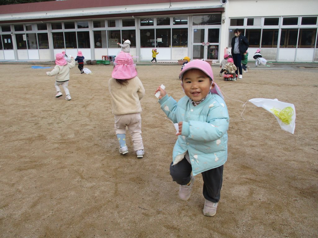 園庭に出て凧揚げをしました。「できない~」と言っていましたが、手を挙げて!走って!と一緒にすると凧があがり始め喜んでいました。風が吹くとよくあがることも分かったようです。園庭を元気に走り回り思いっきり遊び「楽しかった♪」「もっとしたい!」と嬉しそうに話をしていました(*^^*)