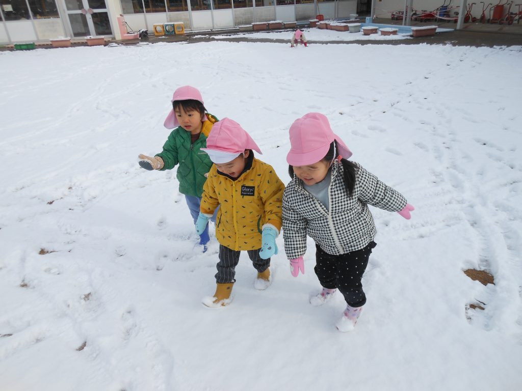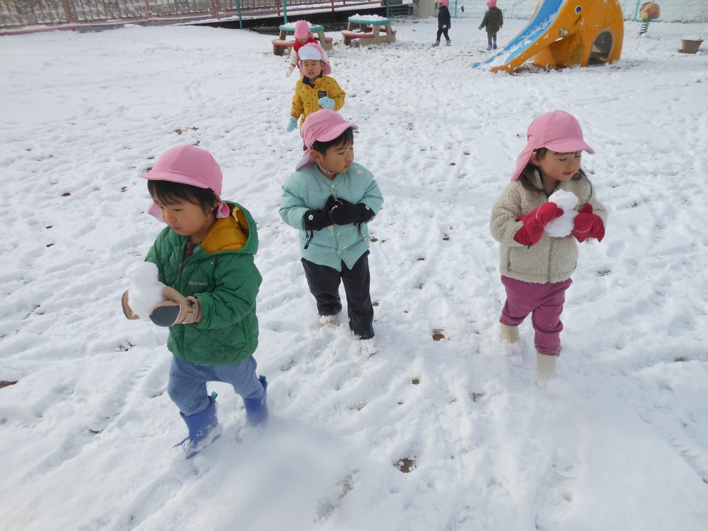 木曜日は寒波がやってきて、雪がたくさん降りました。園庭も真っ白になり、子ども達は大喜びでした。登園するなり「雪だるま作りたい⛄」と言って楽しみにしている子もいました。