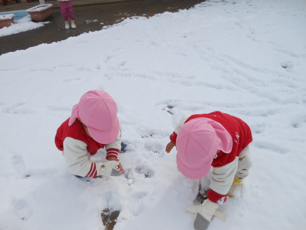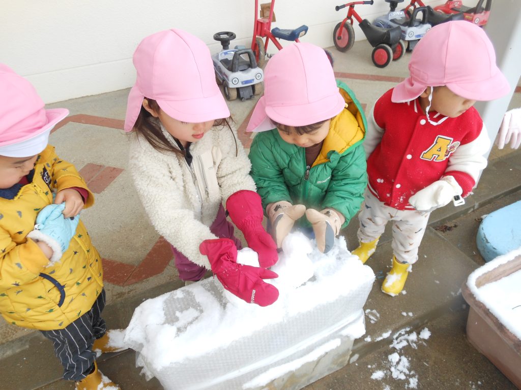 雪をぎゅっぎゅっとして、「冷たい」と言いながらも触って遊んでいました。なかなか固まらなかったようです。