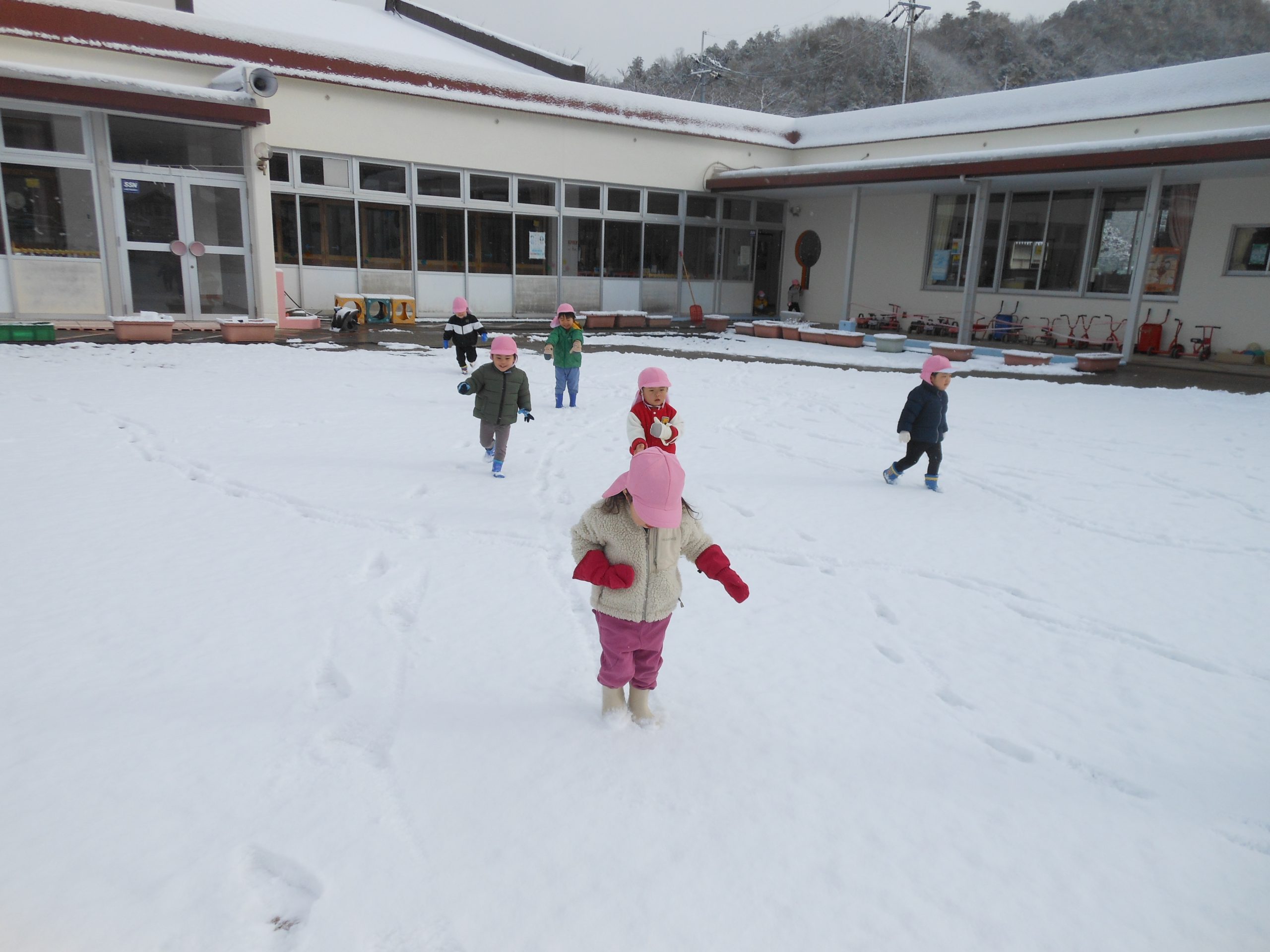 木曜日は寒波がやってきて、雪がたくさん降りました。園庭も真っ白になり、子ども達は大喜びでした。登園するなり「雪だるま作りたい⛄」と言って楽しみにしている子もいました。