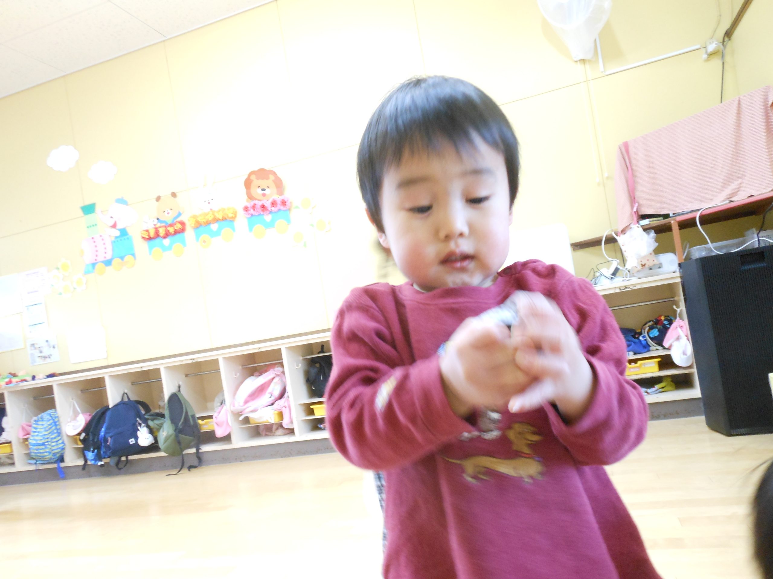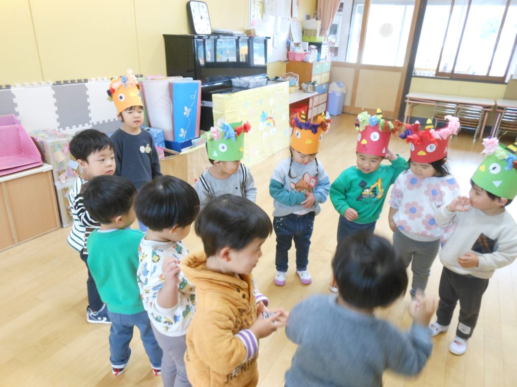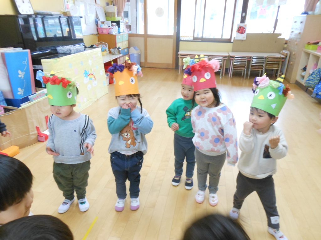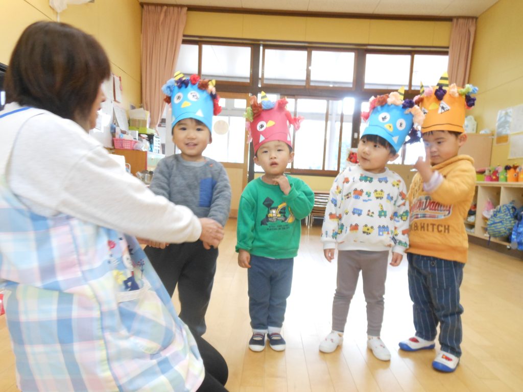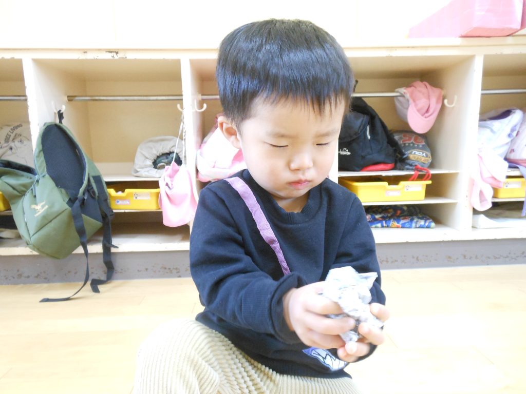 2月3日は節分です。1月の終わりごろから少しずつ節分の話をしていました。絵本を見るなどして鬼にも関心をもち始めました。鬼は豆まきをすると逃げていくので、豆を作って追い払おう!と話をして新聞紙で豆を作り、その時を待ちました。