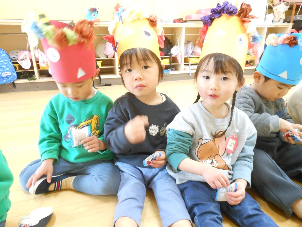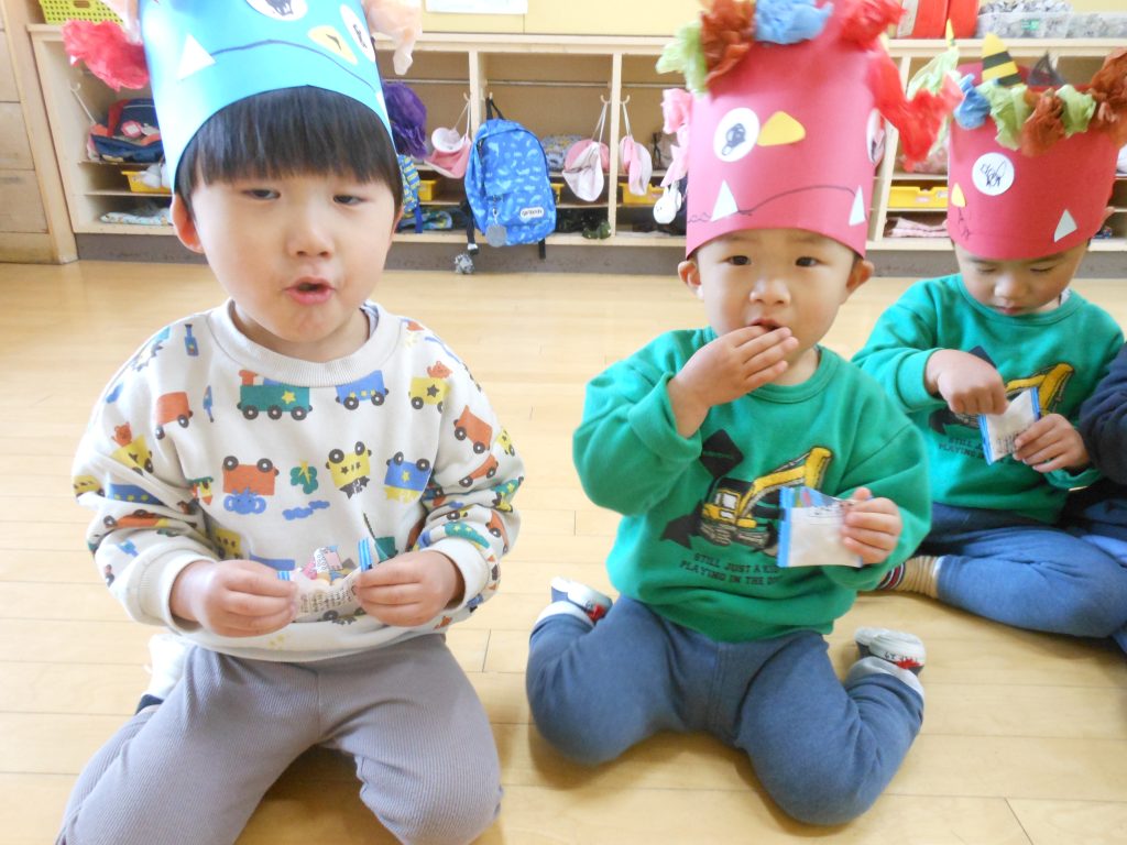 豆まきをした後は、病気をせず元気に過ごせるようにと節分ボーロをみんなで食べました。