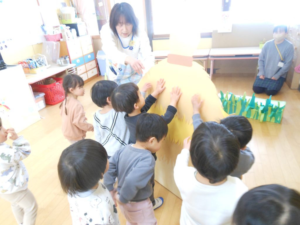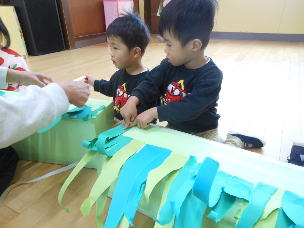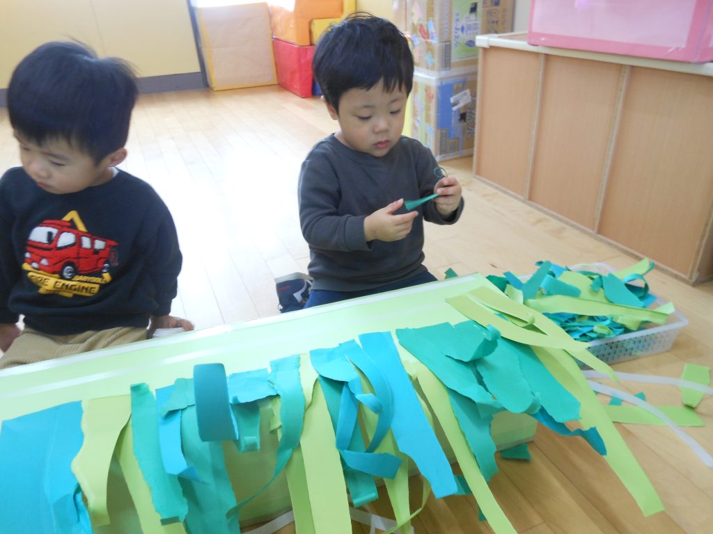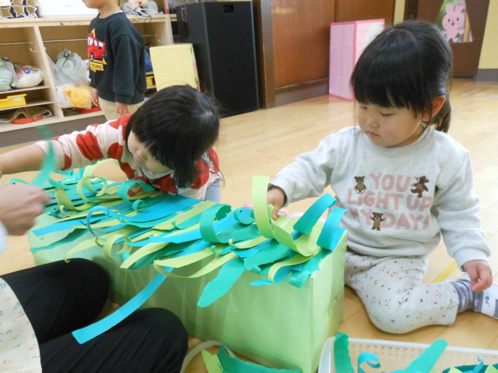 20日の生活発表会に向けて、うさぎ組もお話遊びをしています。動物になっての表現遊びも、やりたい動物の名前を言ってなりきって楽しんでいます。そこで、発表会に向けて小道具の草づくりをしました。