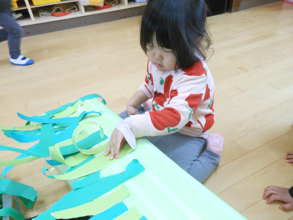 たくさん草の葉っぱができ、それを一つずつ土台に貼っていきました。「ここにつける!」「もっとする~」と楽しんで作れました。中には真剣な表情で、きれいに並べて貼っていく子もいました。