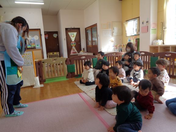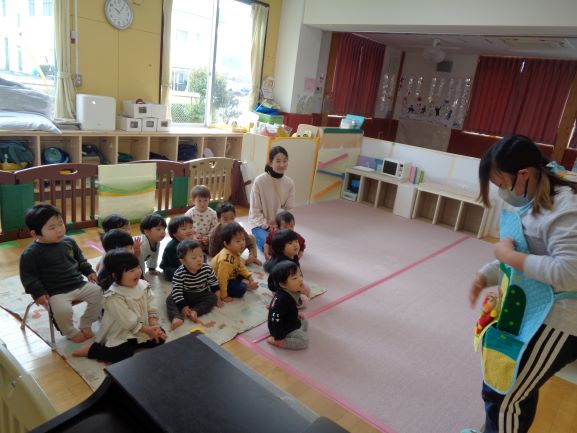 りす・ひよこ組では、「アンパンマンとバイキンマン」のエプロンシアターをしてもらい、アンパンマンや、ジャムおじさん、バイキンマンが出てくると、指をさしながら喜んで見て、アンパンマンの顔が大きくなる時には、ちょっぴり驚いた顔をしていて、最後まで喜んで見ていました。