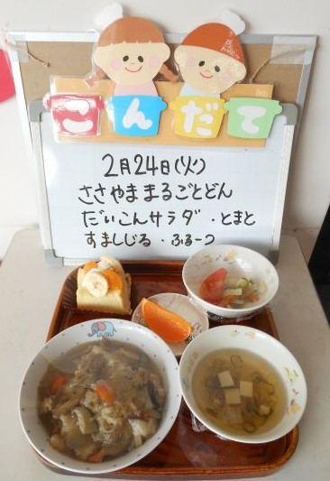 誕生日の給食では、丹波篠山のおいしものがたくさん入っている「篠山まるごと丼」を食べて、元気いっぱいになった城東保育園のみんなです。