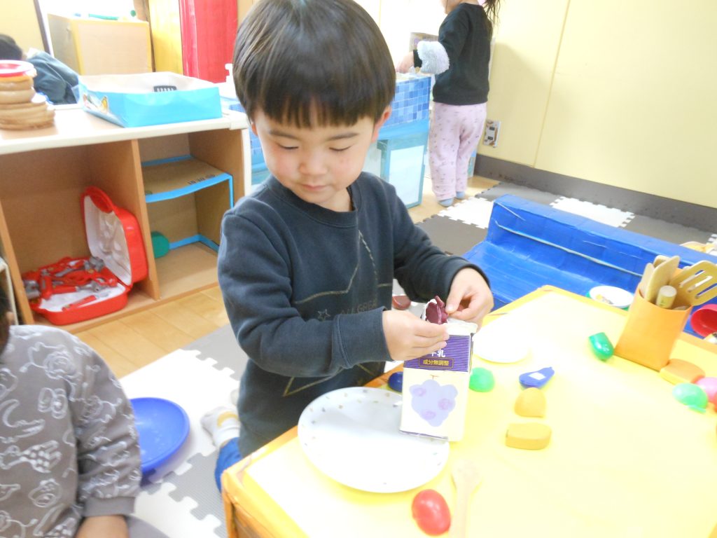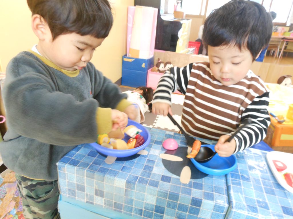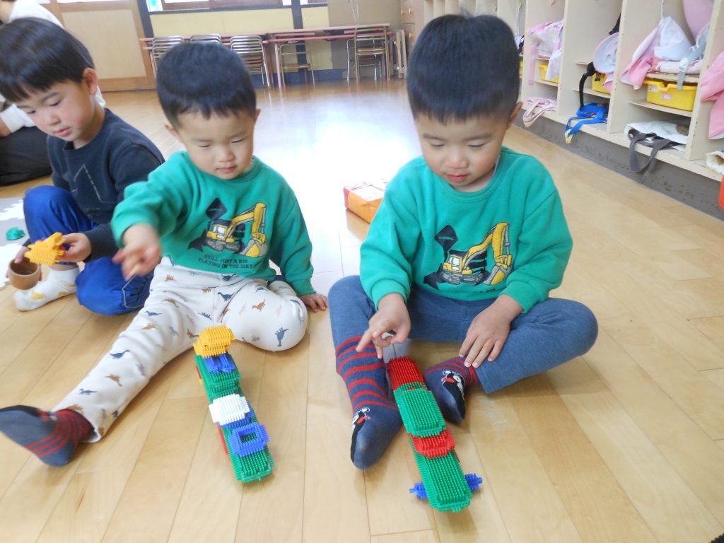 お友達と一緒に遊ぶことが楽しくなり、本当に楽しそうに遊んでいる姿を見ると保育者も笑顔になります。遊び方も変わってきて、見立てあそびができるようになったり、言葉でやりとりしながらのごっこ遊びもできるようになったり、指先を使った遊びもできるようになったりと遊びの中にも成長を感じることができ嬉しく思っています。