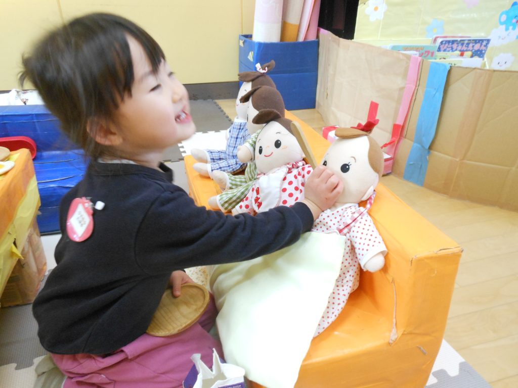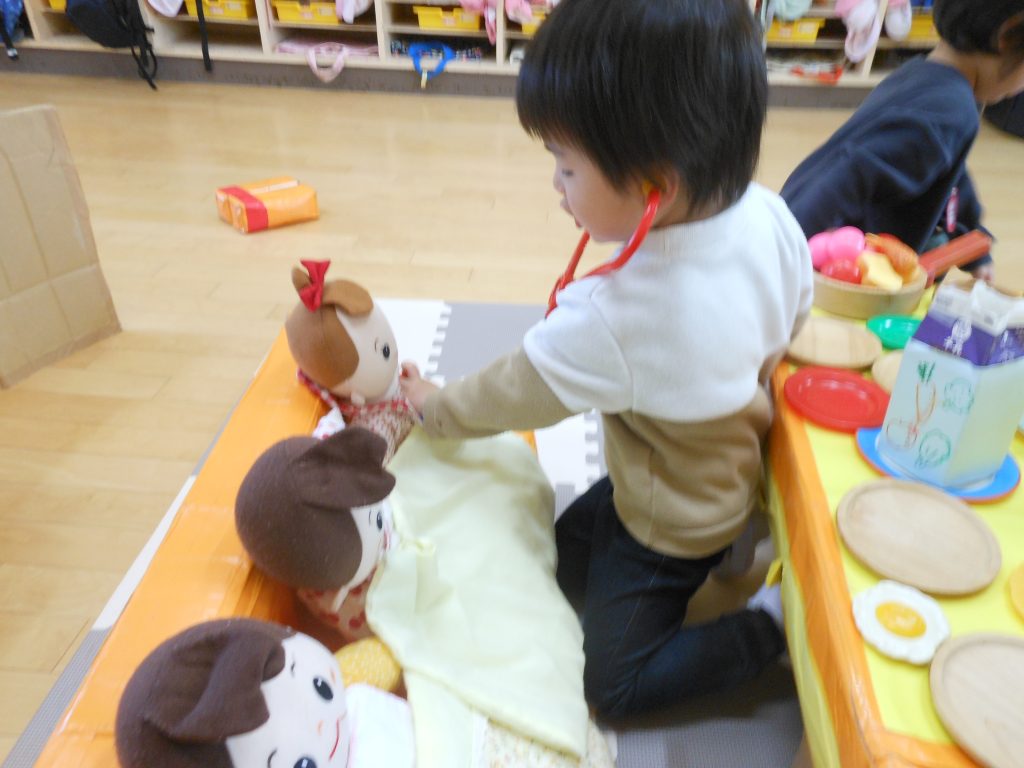 毎日、朝の持ち物の始末を済ますと自分の気に入ったおもちゃを選び、お友達と好きな遊びを楽しんでいます。おままごとや人形あそび、お医者さん、ブロック、パズル等々いろいろな遊びを楽しんでいます。