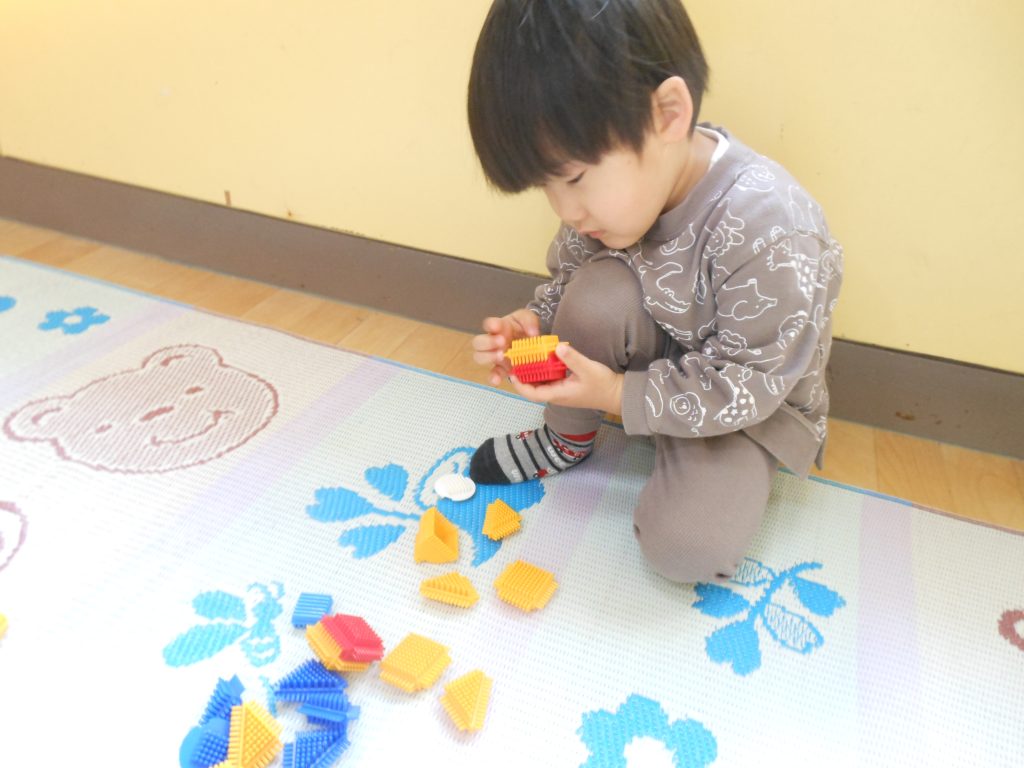 指先も強くなりブロックを重ねて自分の好きな物に見立てて作って遊んでいます。パトカー、白バイ、飛行機、お家など、それぞれに思うものを上手に作っています。